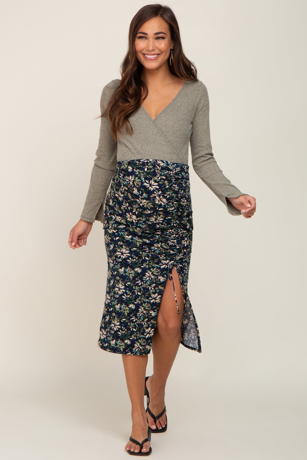 Navy Floral Ruched Slit Maternity Midi Skirt