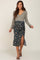 A floral maternity midi skirt featuring a front slit and self-tie adjustable ruching.