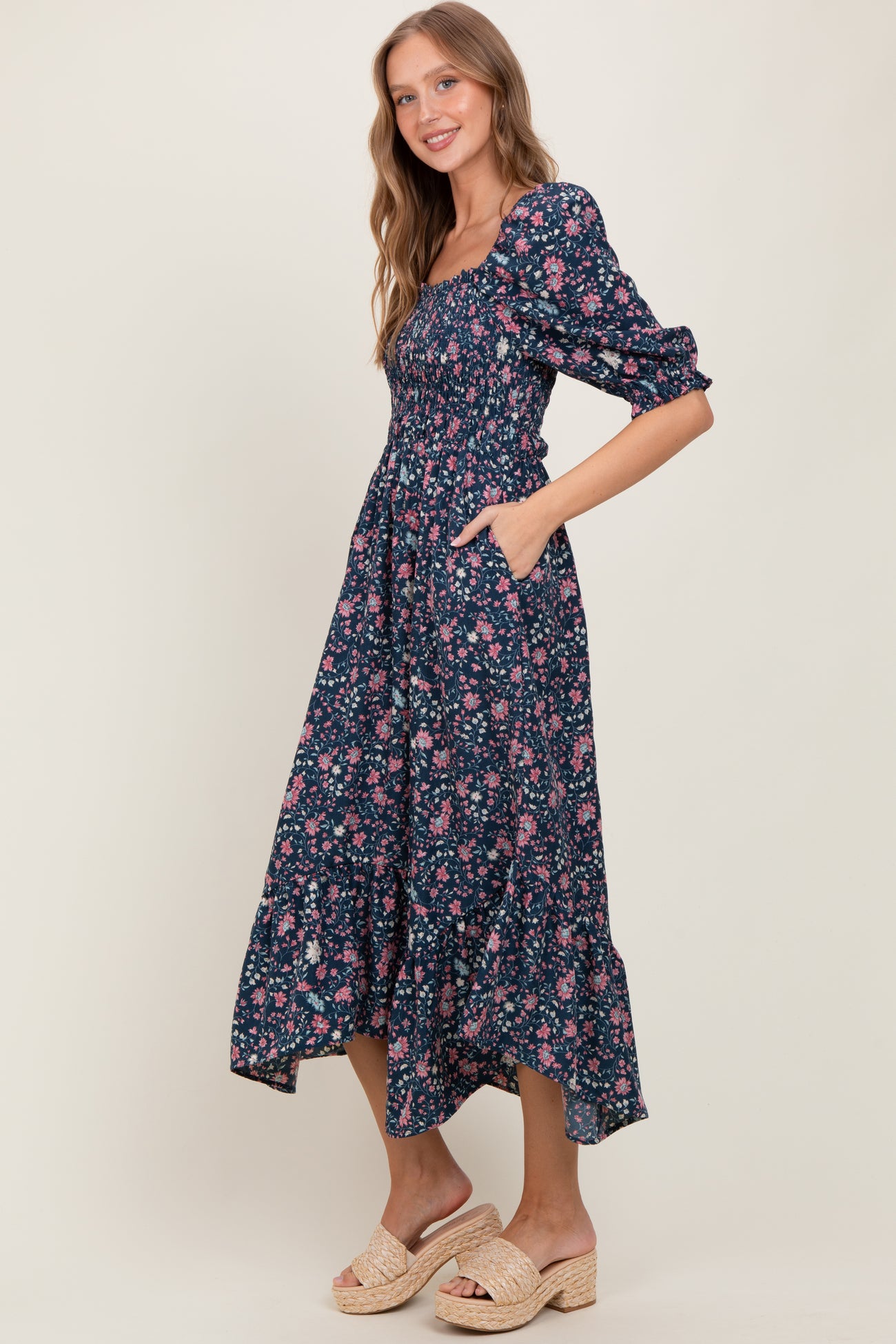 Navy Floral Smocked Handkerchief Hem Maxi Dress