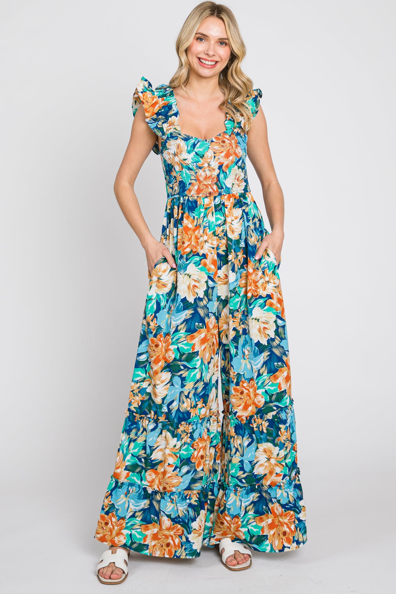Navy Floral Smocked Ruffle Accent Jumpsuit