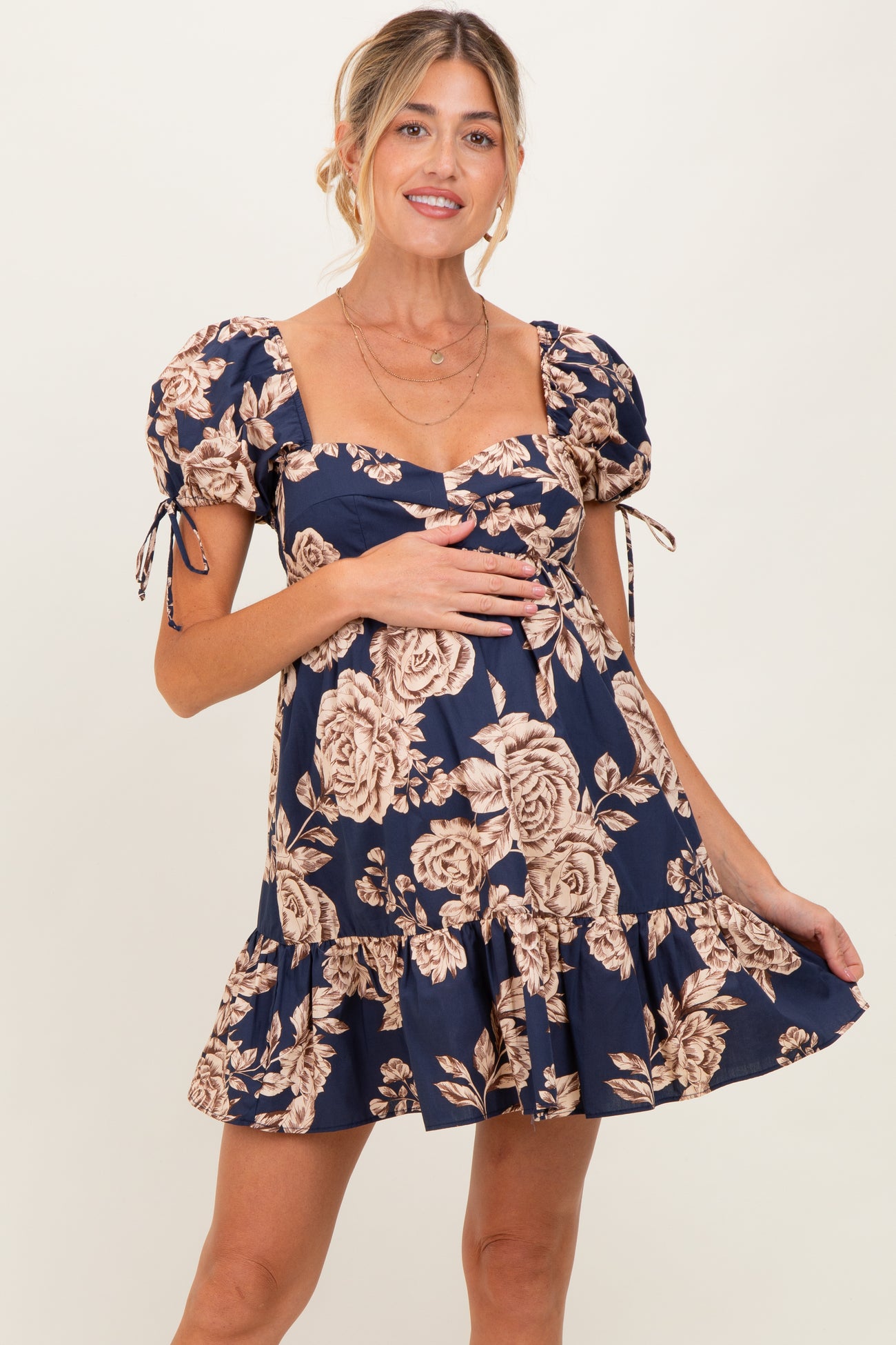 Navy Floral Sweetheart Neckline Maternity Mini Dress