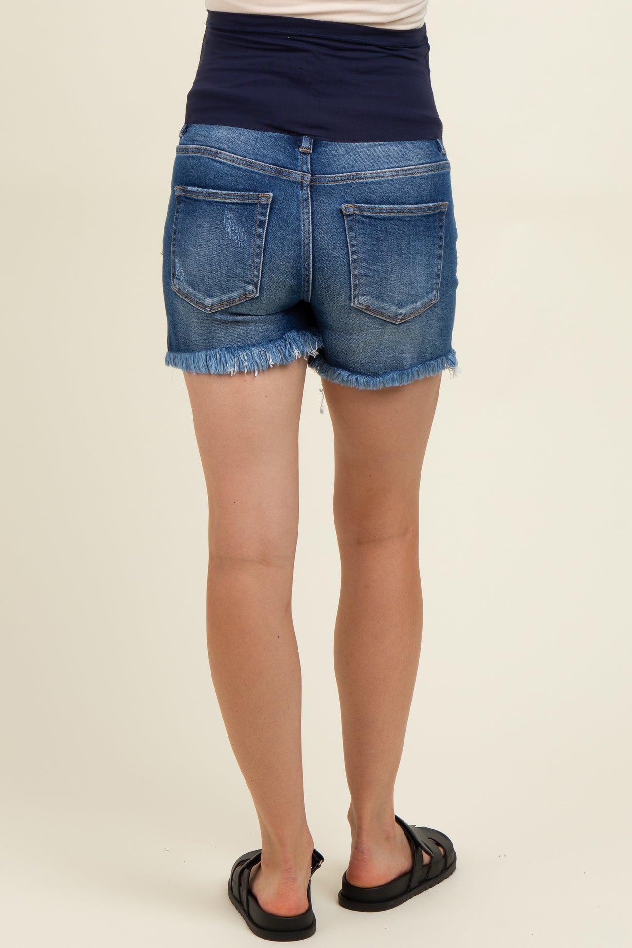 Navy Fringe Hem Side Slit Maternity Denim Shorts