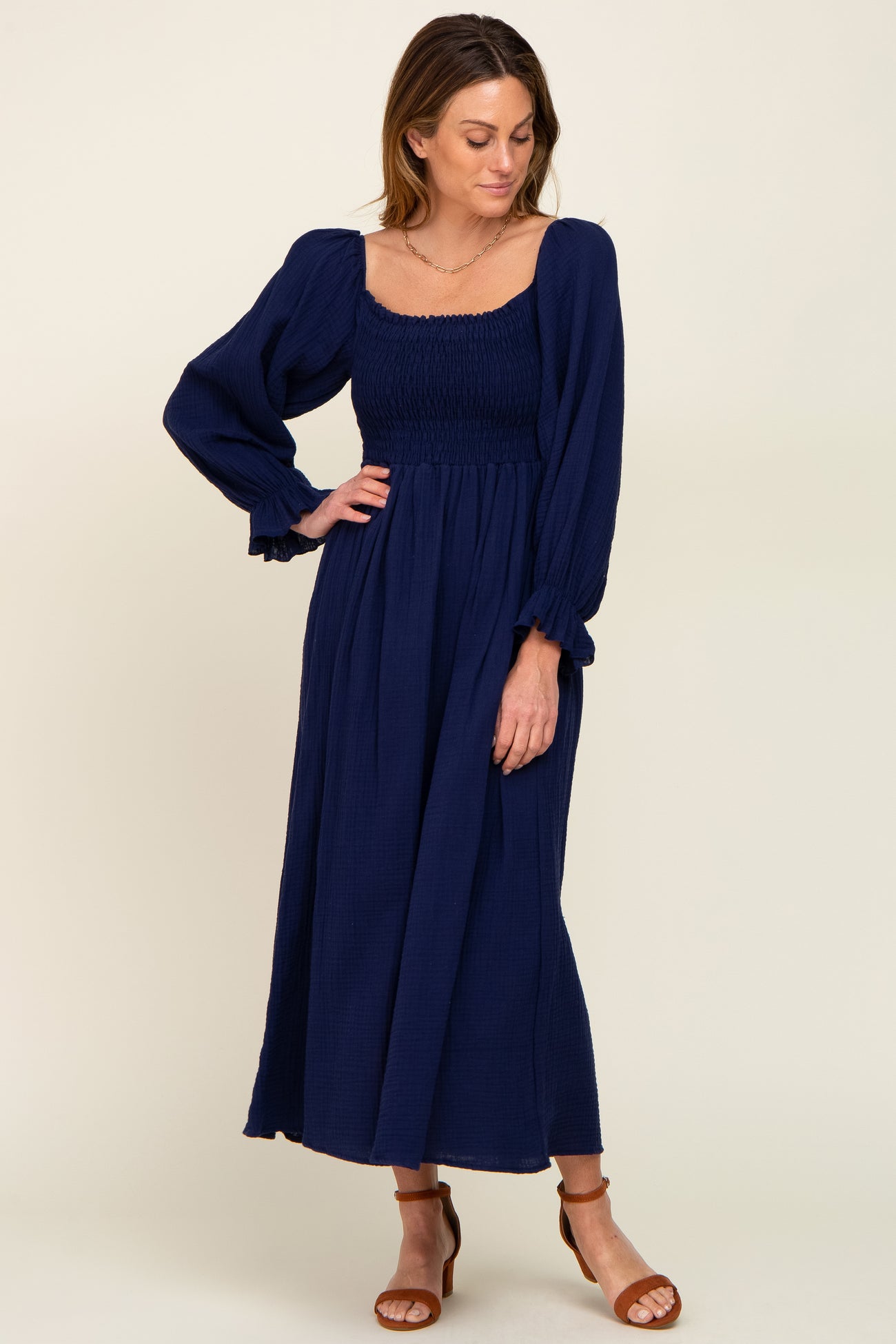 Navy Gauze Smocked Midi Dress