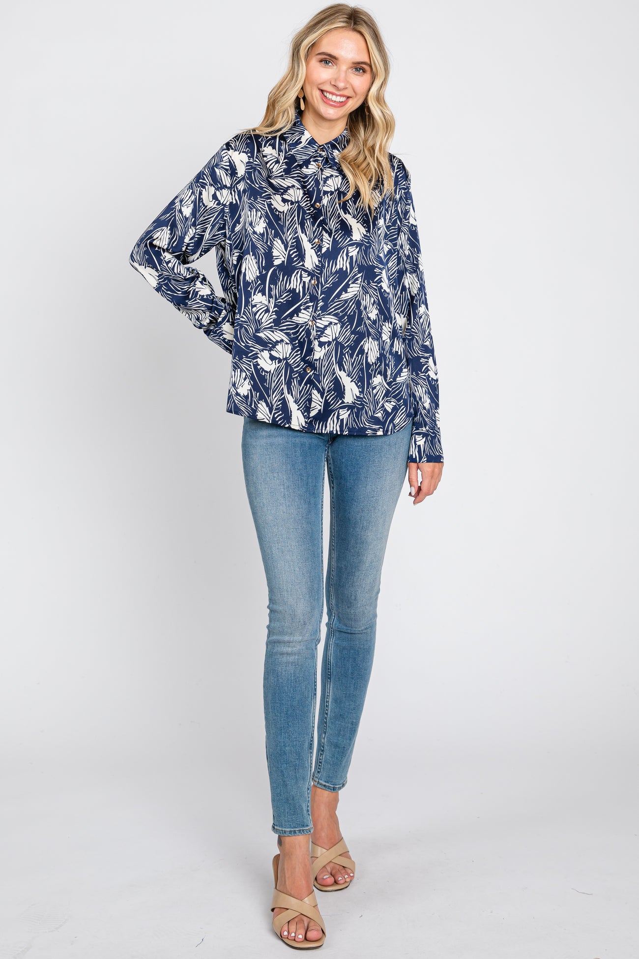 A leaf print, satin top with long cuffed sleeves, a collar, front functioning buttons, and a curved hi-lo hem.