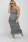 A leaf print maternity midi dress featuring a smocked elastic body with ruffle trim, and adjustable cami straps.