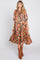 A floral and paisley print midi dress. Features a collar, a split v-neckline, half-length puff sleeves with smocked cuffs, and a tiered skirt.