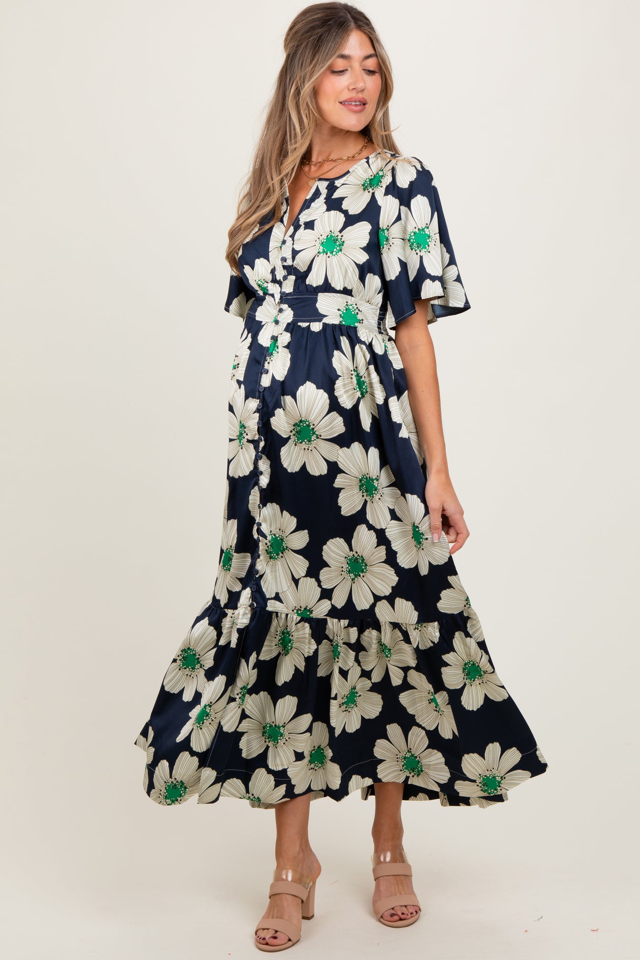 Navy Notched Collar Floral Button Down Maternity Maxi Dress