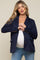 A pinstripe maternity blazer featuring a notched lapel, front buttons, long sleeves with button accents, and two front pockets. Blazer is fully lined.