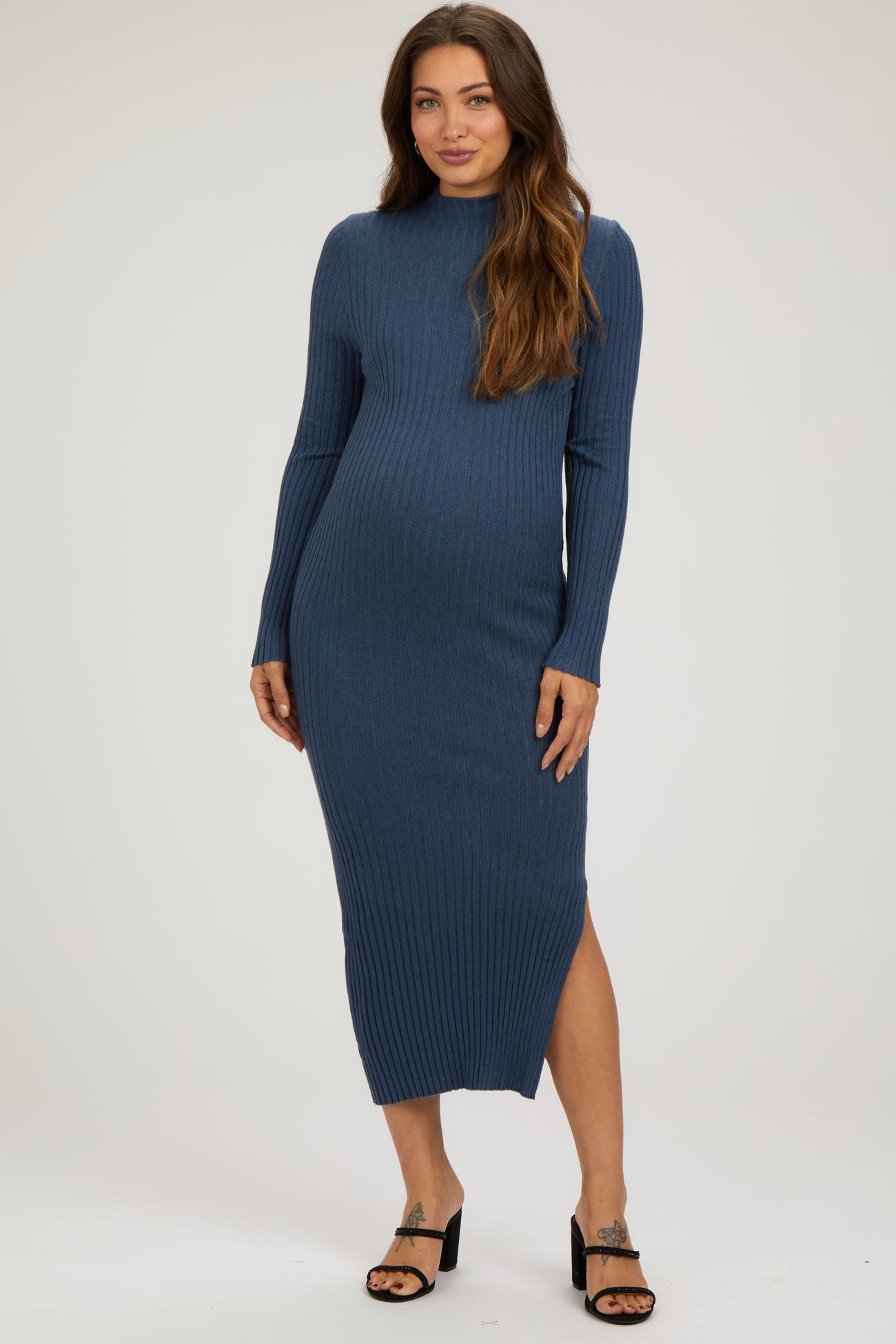 Navy Ribbed Mock Neck Side Slit Maternity Midi Dress
