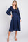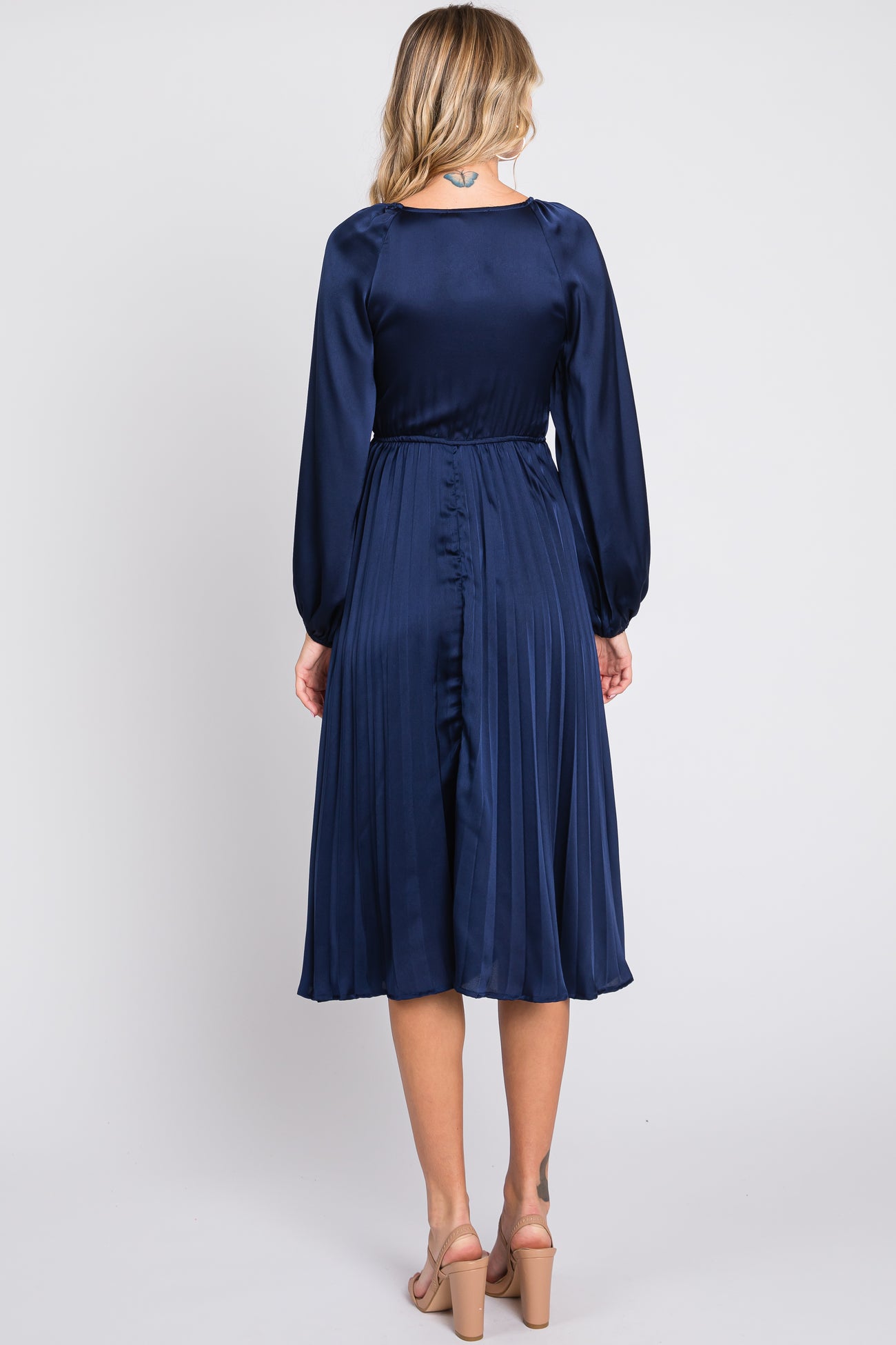 A satin midi dress with a v-neckline, a smocked top, long sleeves, and a pleated skirt.
