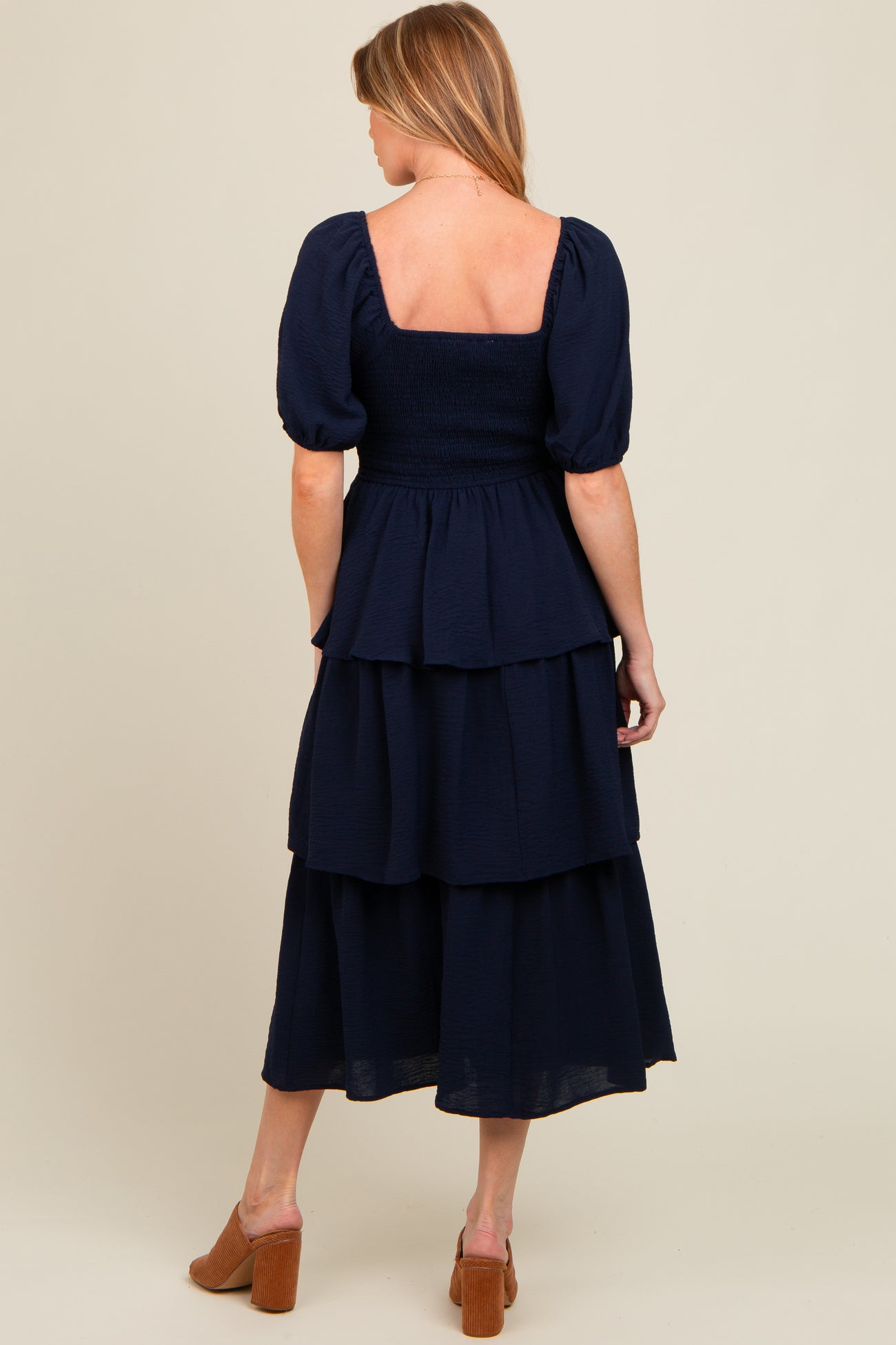 Navy Smocked Body Ruffled Tiered Maternity Midi Dress