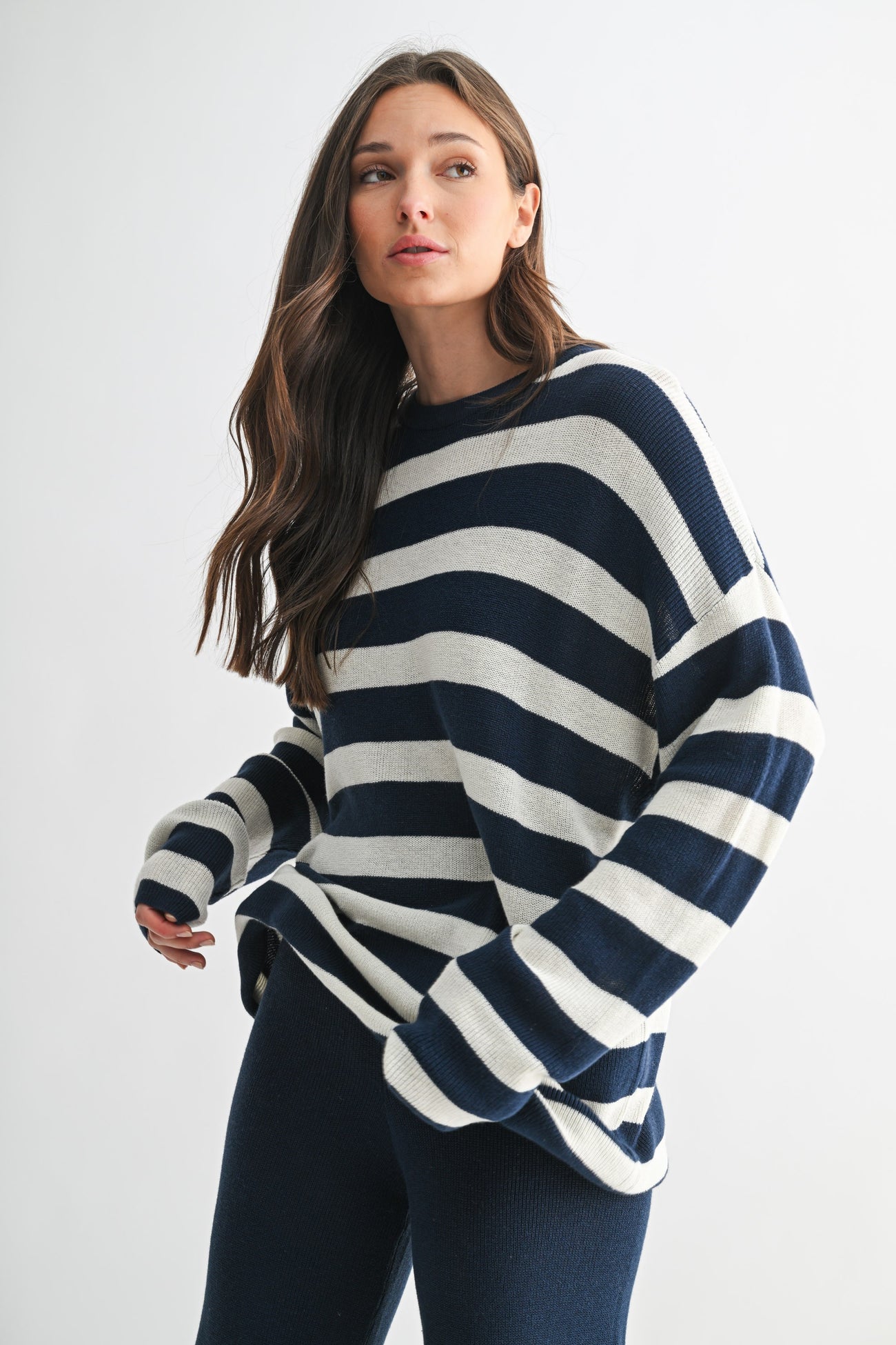 Navy Striped Long Sleeve Sweater Knit Pants Set