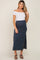 A striped maternity maxi skirt. Features an elastic waistband and side slits.