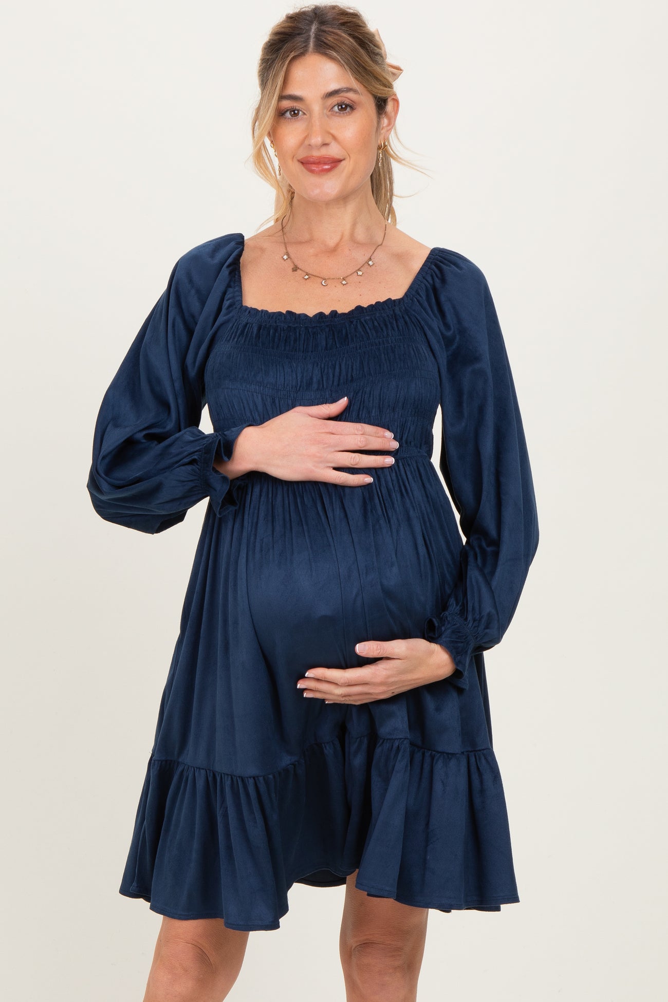 Embrace comfort and style with this chic suede maternity dress, designed to flatter your growing bump while keeping you effortlessly elegant. Featuring a smocked bodice with a square neckline, this dress offers a flexible fit that adapts to your shape throughout pregnancy. The long, billowy sleeves with elastic cuffs add a touch of feminine charm, while the tiered skirt creates a graceful silhouette and allows for easy movement. Made from soft, breathable fabric, this dress is perfect for any occasion, from casual outings to special events. Pair it with your favorite heels or flats for a polished maternity look.