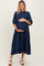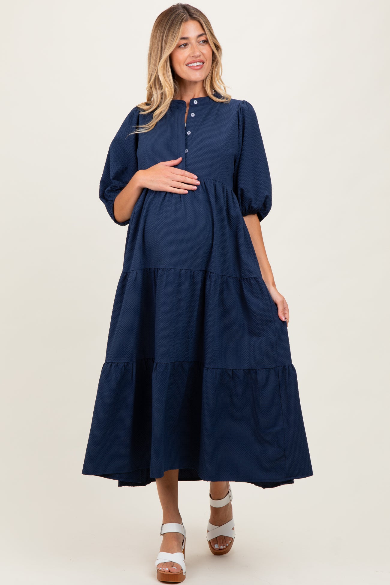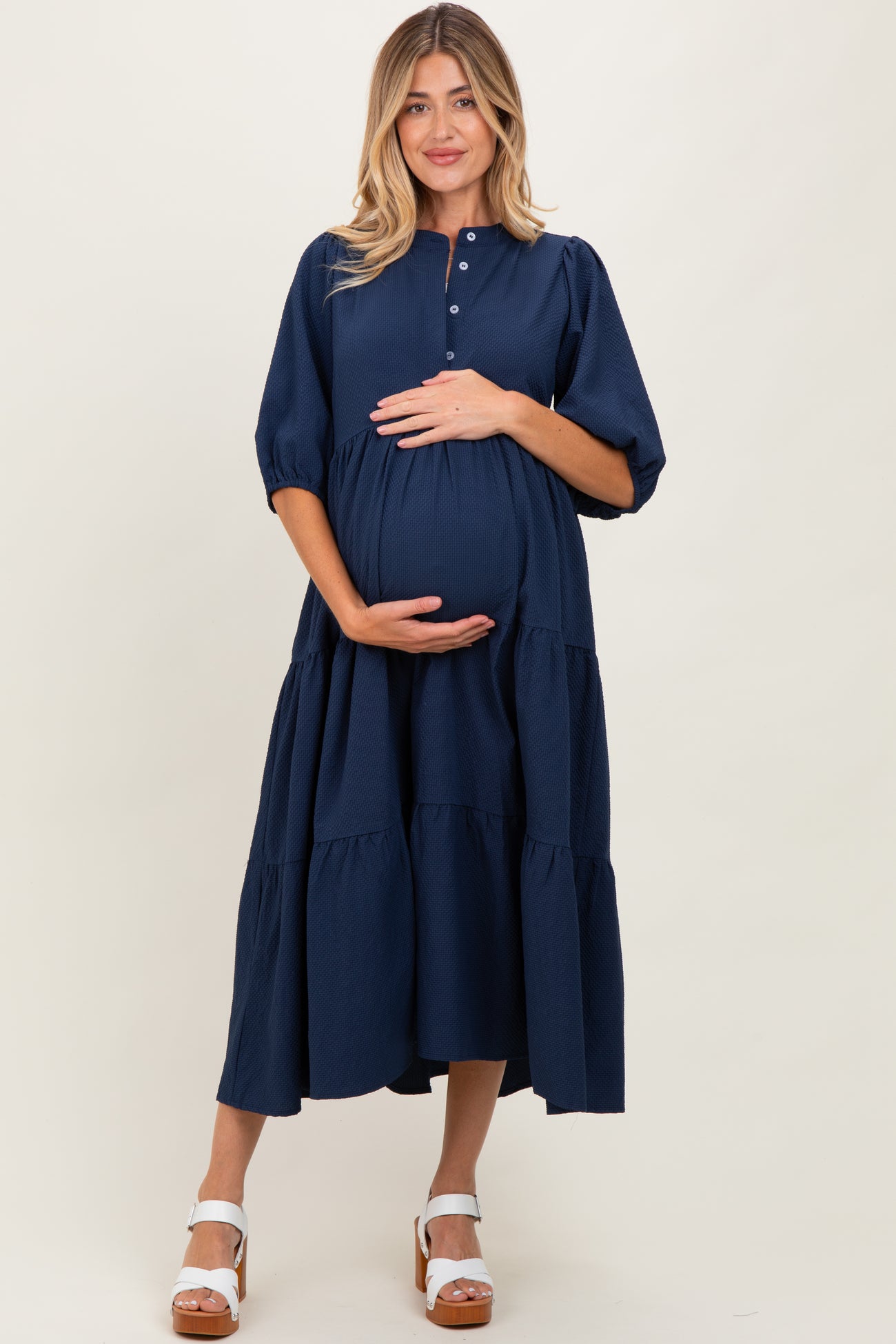 Navy Textured Tiered Puff Sleeve Maternity Midi Dress