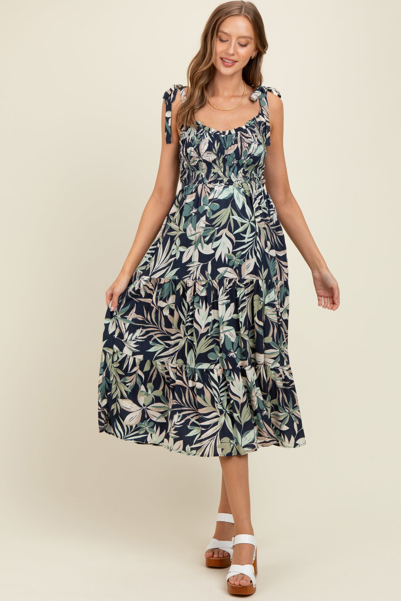 Navy Tropical Print Smocked Shoulder Tie Maternity Midi Dress