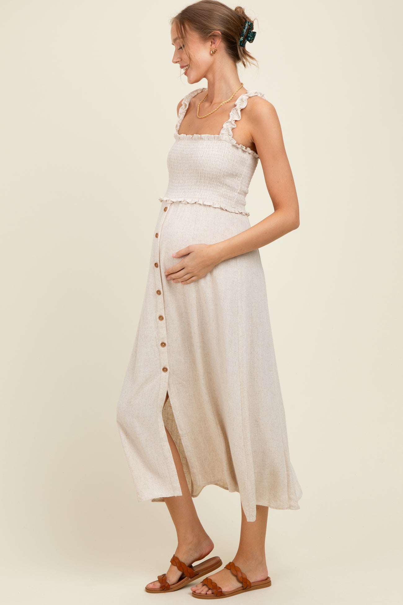 Oatmeal Smocked Button Front Linen Blend Maternity Midi Dress
