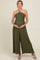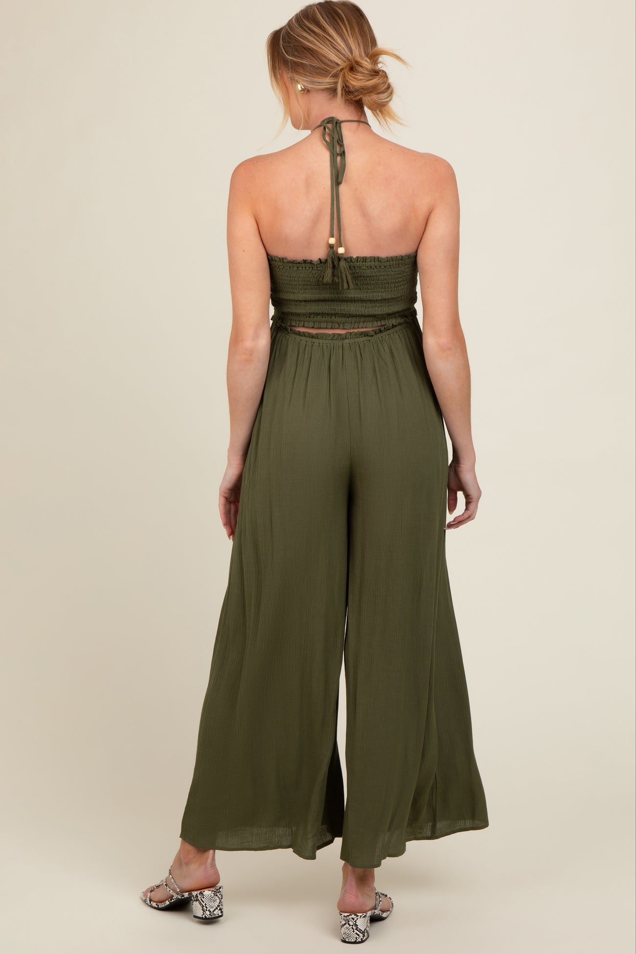 Olive Back Cutout Smocked Halter Wide Leg Maternity Jumpsuit