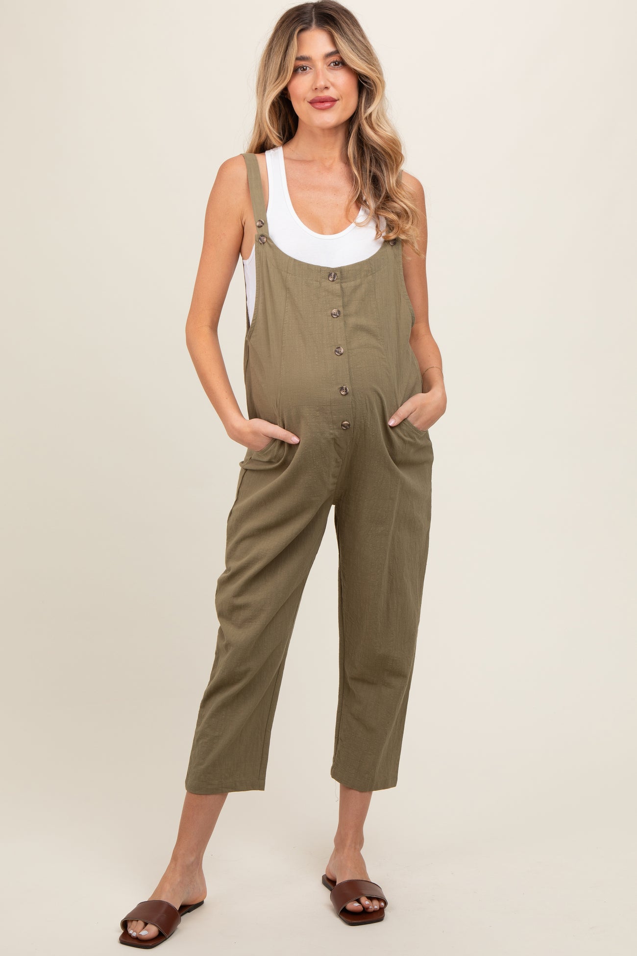 A solid lightweight cropped maternity jumpsuit with adjustable button straps, button down detail on bust and side pockets.
