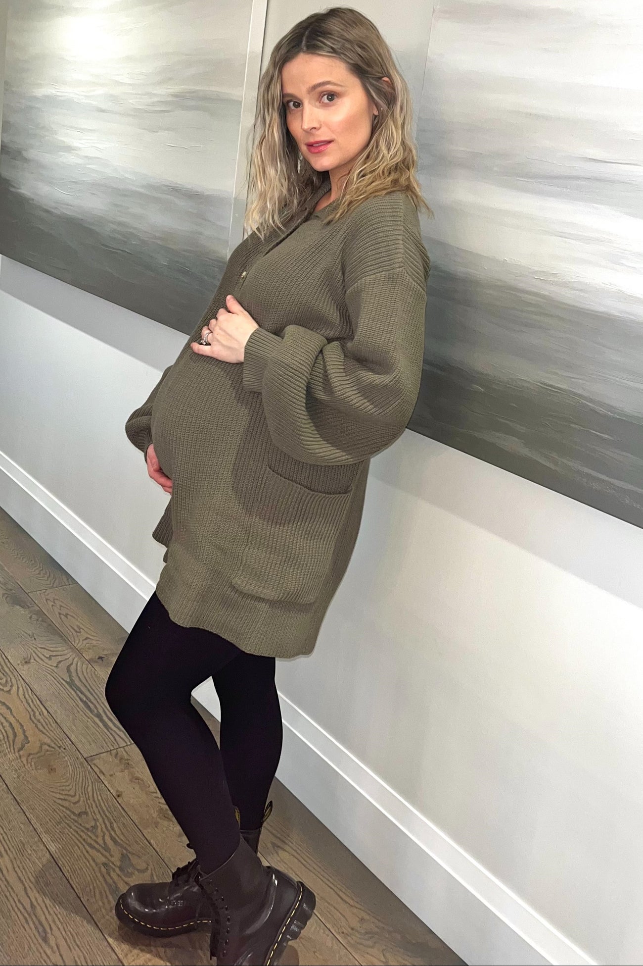 A maternity sweater romper with a collared neckline and button accent in front. Also includes two large side pockets.