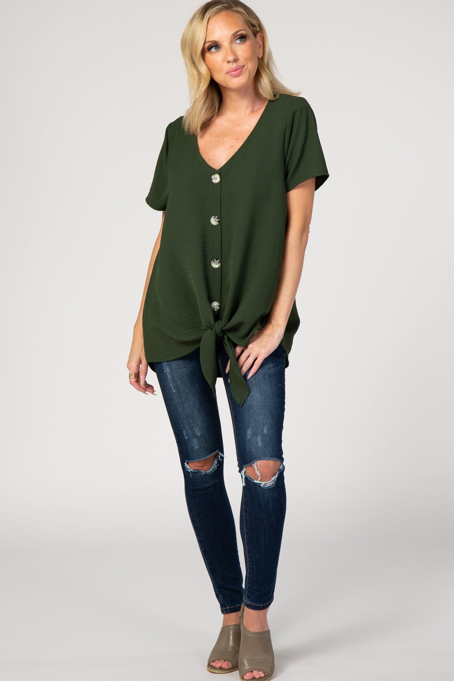 A solid hued top featuring a button accent on front, a tie accent on hemline, a v-neckline, and short sleeves.