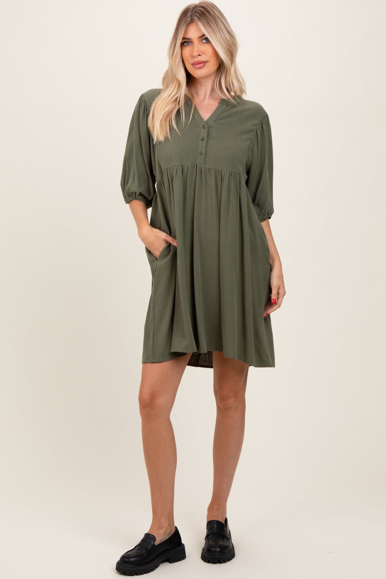 Elevate your everyday style with our Olive Button Up Split Neck Dress. Featuring a flattering V-neck with delicate button details and a relaxed fit, this dress is perfect for effortless chic. The soft olive fabric drapes beautifully, while the split neck adds a subtle hint of sophistication. With three-quarter puff sleeves and a gathered waistline, it balances comfort and style seamlessly. Dress it up with heels or keep it casual with flats or boots. A versatile wardrobe essential for any season!