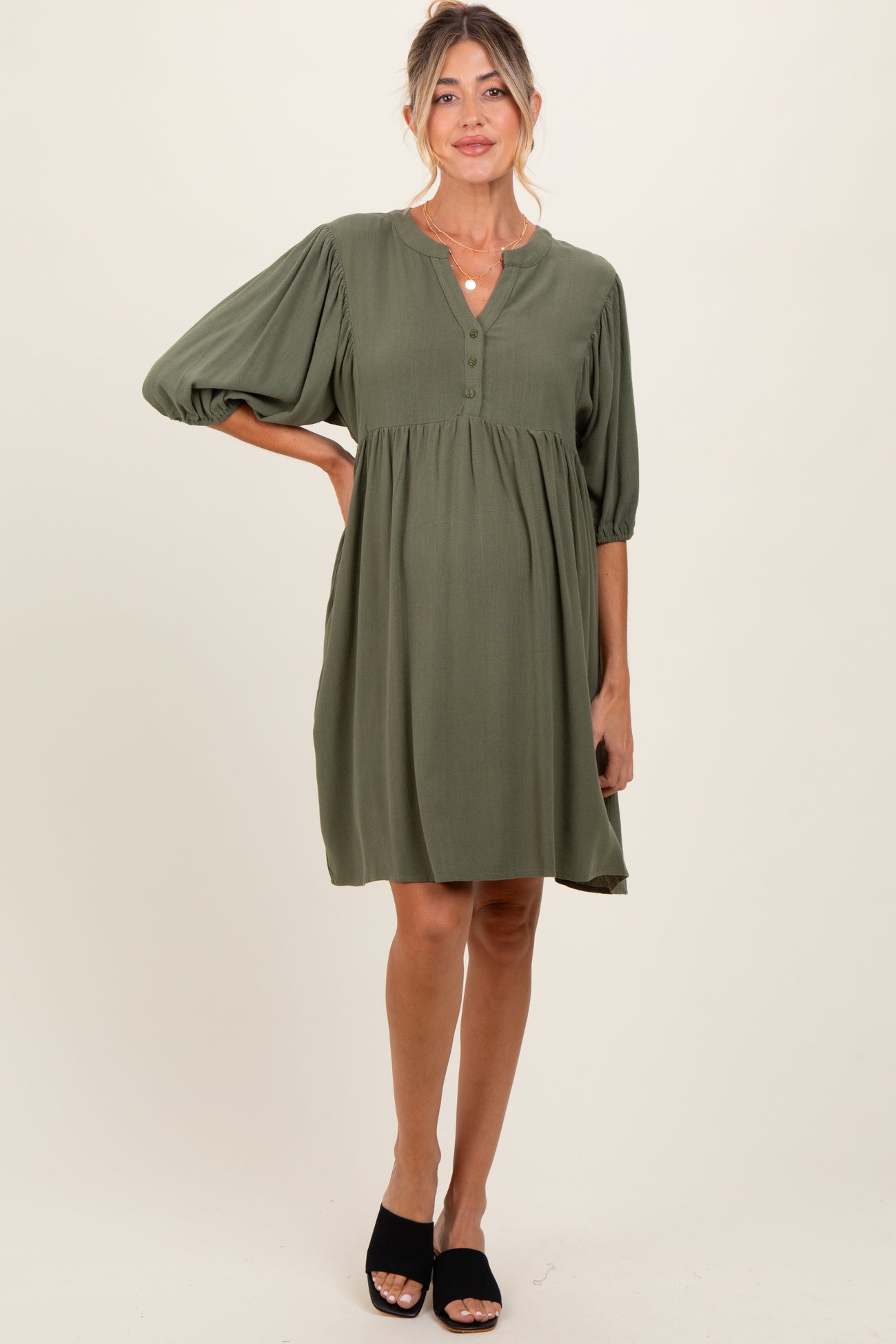 Stay stylish and comfortable throughout your pregnancy with our Olive Button Up Split Neck Maternity Dress. Crafted from lightweight, breathable fabric, this dress features a flattering A-line silhouette with gentle gathers under the bust to accommodate your growing bump. The split neckline with button-up detail adds a chic touch, while the three-quarter puff sleeves provide a trendy, relaxed fit. Perfect for casual outings or dressing up with your favorite accessories, this versatile dress combines effortless style with ultimate comfort. Available in a beautiful olive green, it’s a must-have for any maternity wardrobe. Machine washable for easy care.