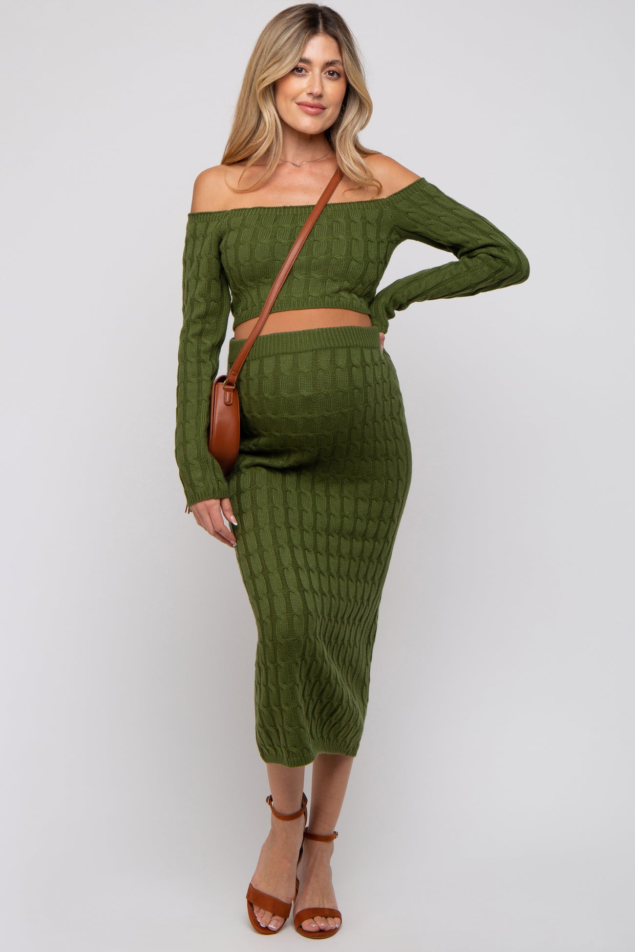 A cable knit maternity midi skirt set featuring an off shoulder, long sleeve crop top and a midi skirt.