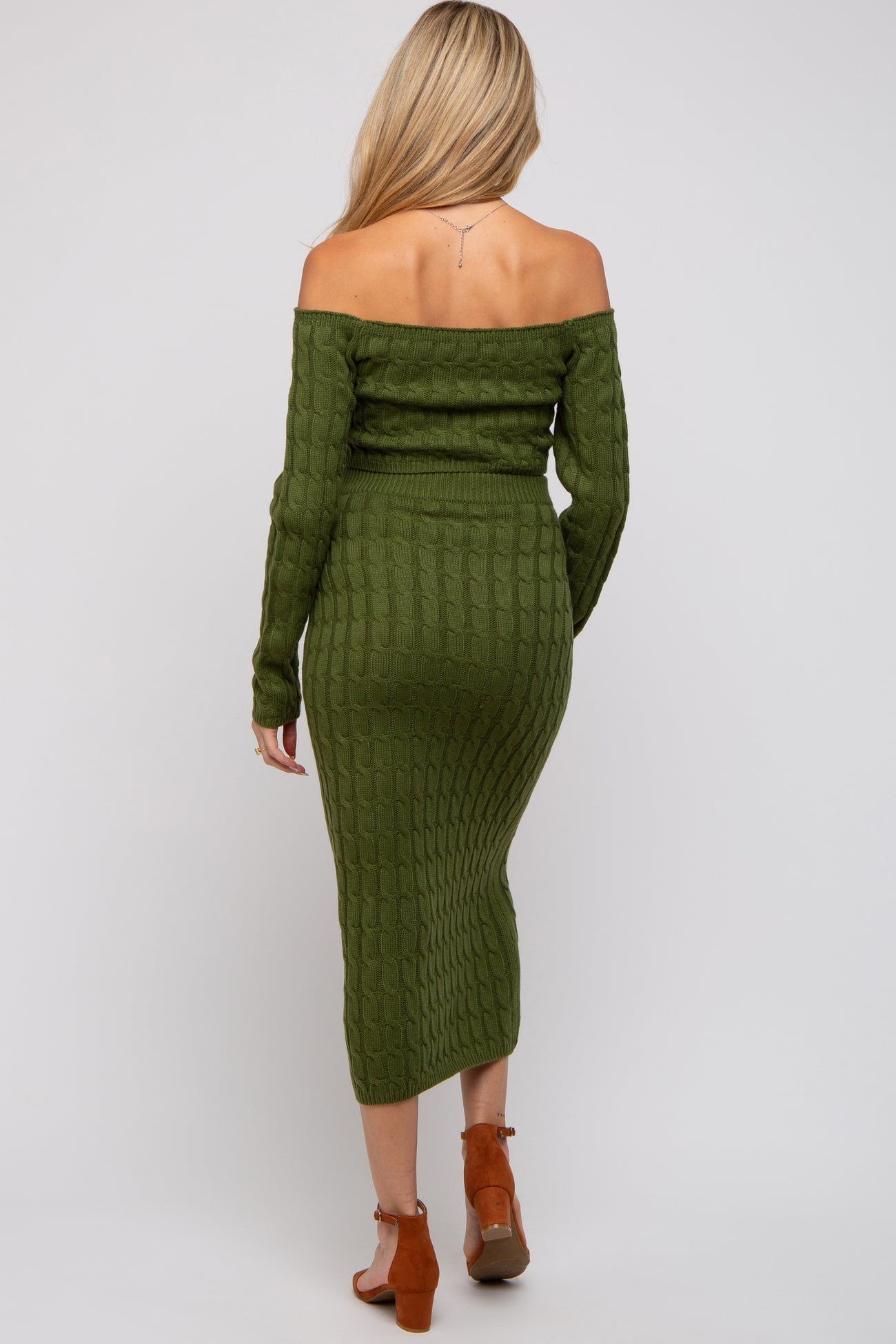 Olive Cable Knit Off Shoulder Maternity Midi Skirt Set