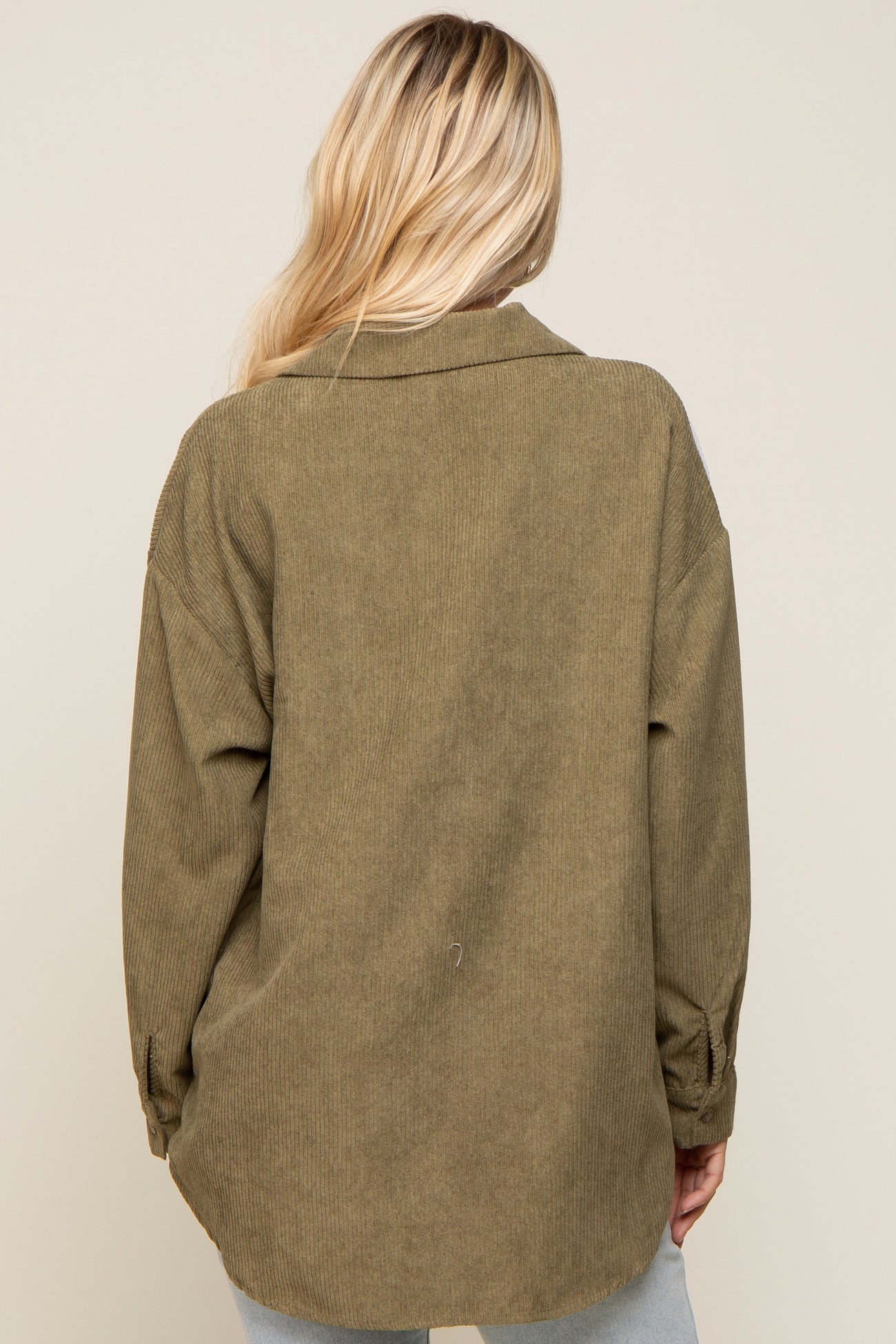 A color blocked corduroy button down top featuring a collared neckline, long sleeves and a rounded hi-low hem.