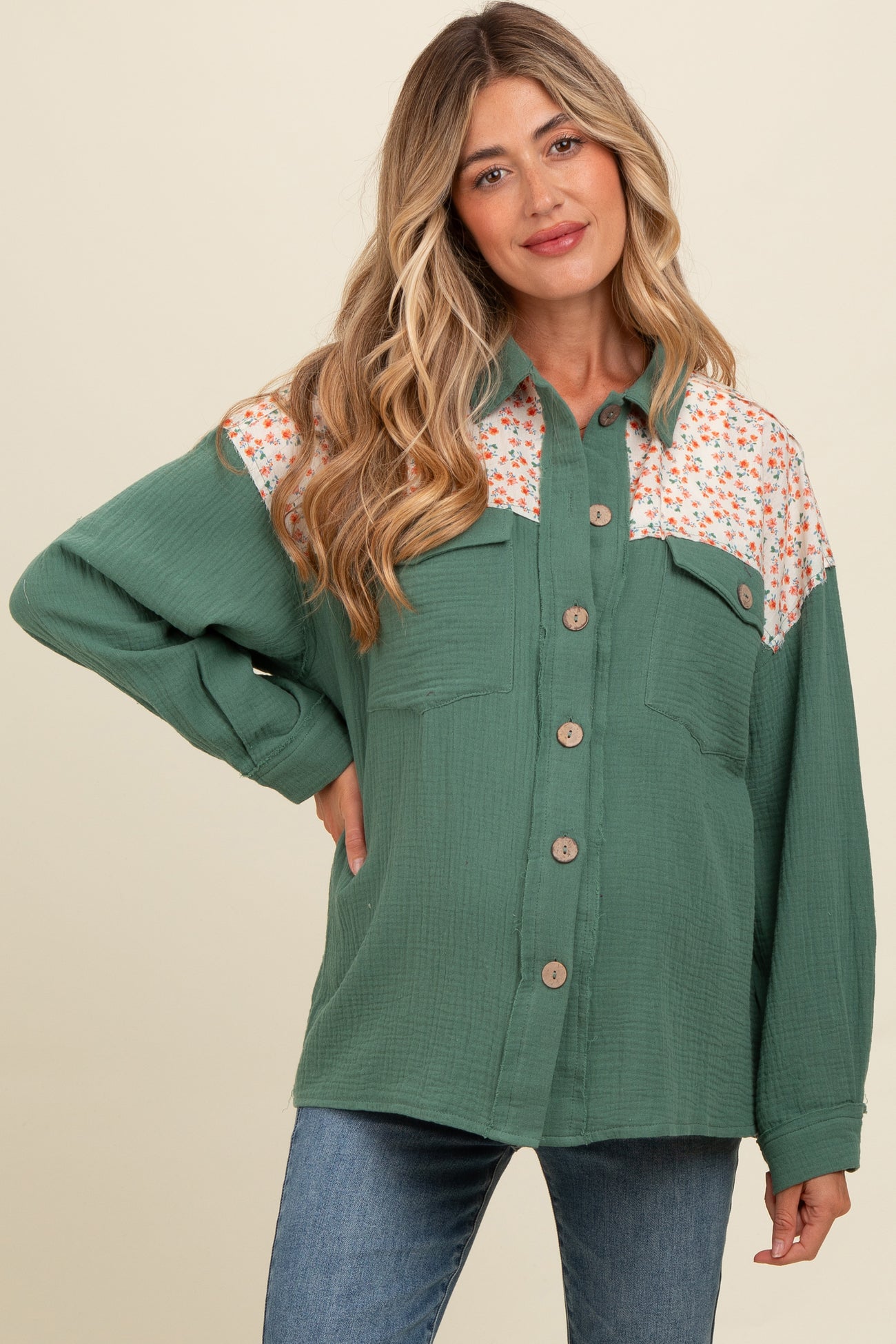 Olive Colorblock Floral Maternity Button Down
