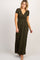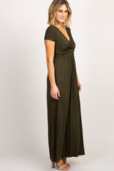 A solid draped maxi dress featuring a v-neckline, short sleeves, and cinching under the bust.