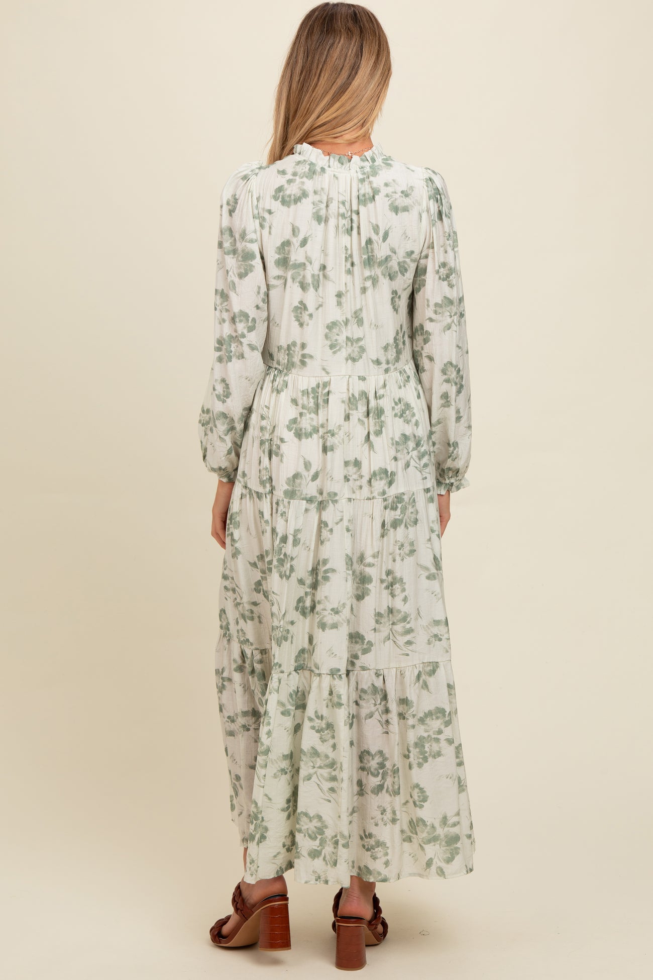 Olive Floral Button Front Tiered Long Sleeve Maternity Maxi Dress