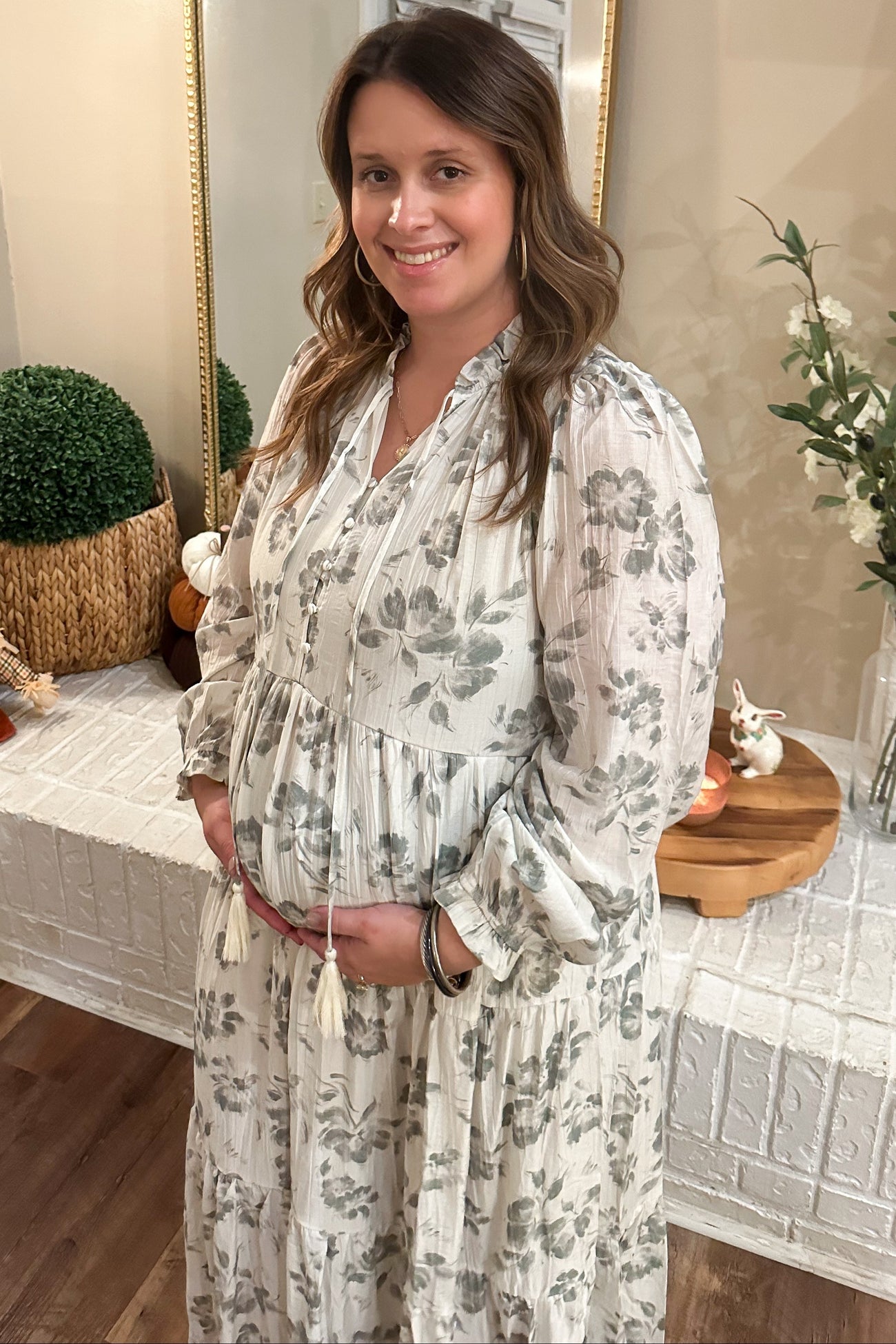 Step into effortless style with our Floral Button Front Tiered Long Sleeve Maternity Maxi Dress. Featuring a graceful tiered silhouette and elegant floral print, this dress blends comfort and fashion for every trimester. The soft, flowy fabric stretches with your growing bump, while the button-front design offers easy nursing access post-pregnancy. Long sleeves and a flattering V-neckline make it perfect for any occasion—from baby showers to brunch dates. Pair with flats or sandals for a versatile, on-trend maternity look you’ll love all season long.