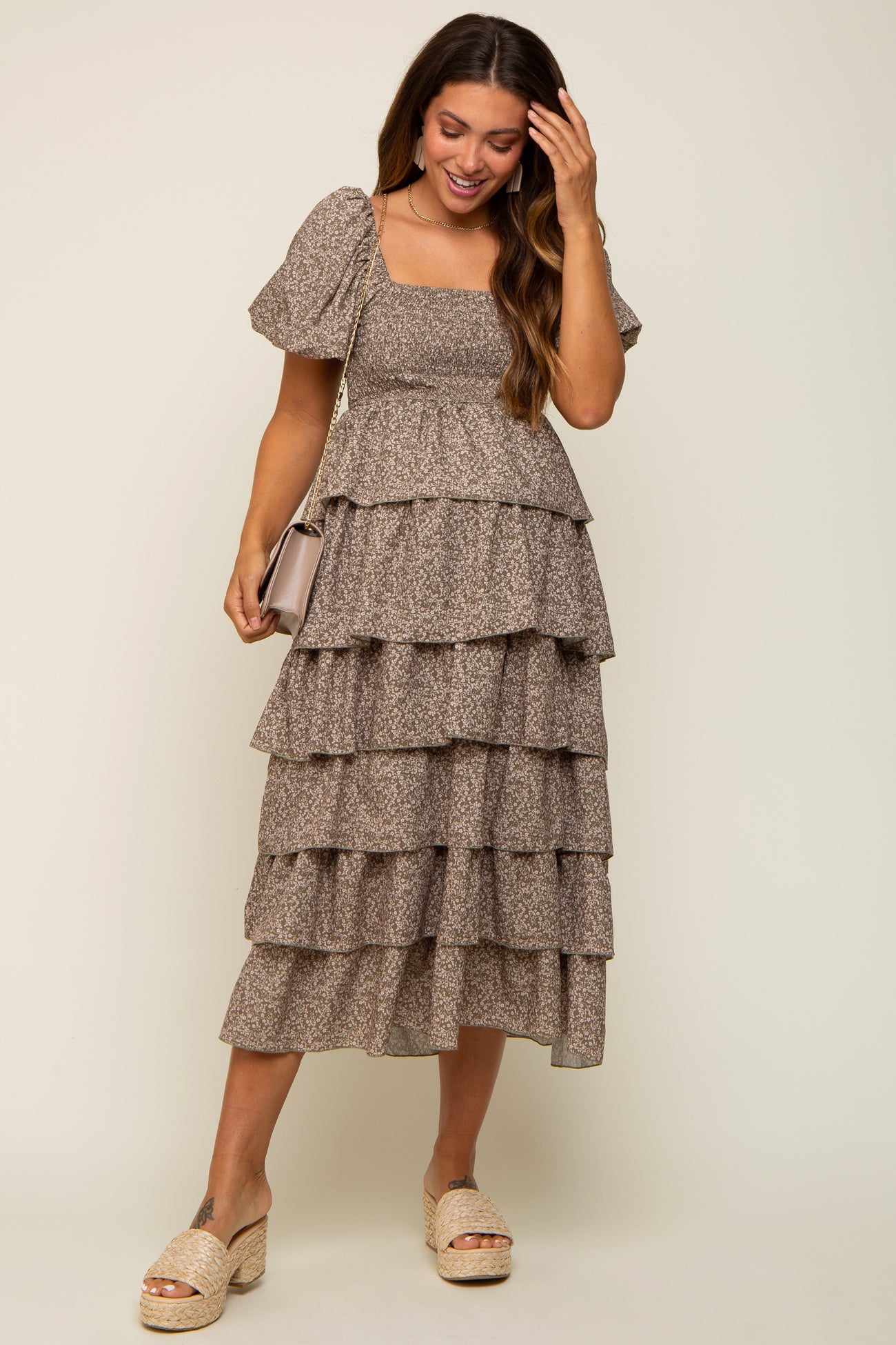A floral maternity midi dress with a squared neckline, short puff sleeves, and a flounce tiered skirt.