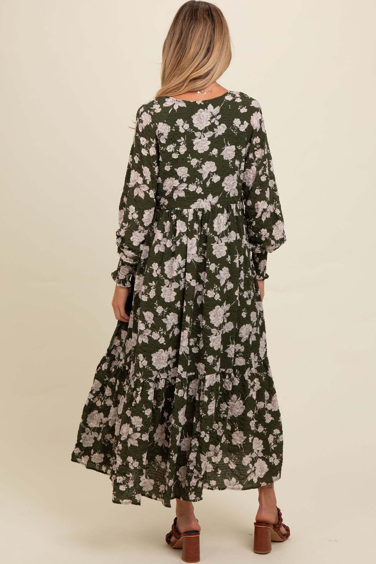 Olive Floral Textured Bubble Sleeve Maternity Maxi Dress