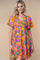 A printed dress with a v-neckline, a smocked bodice, a back tie, short flounce sleeves, and a lined body.