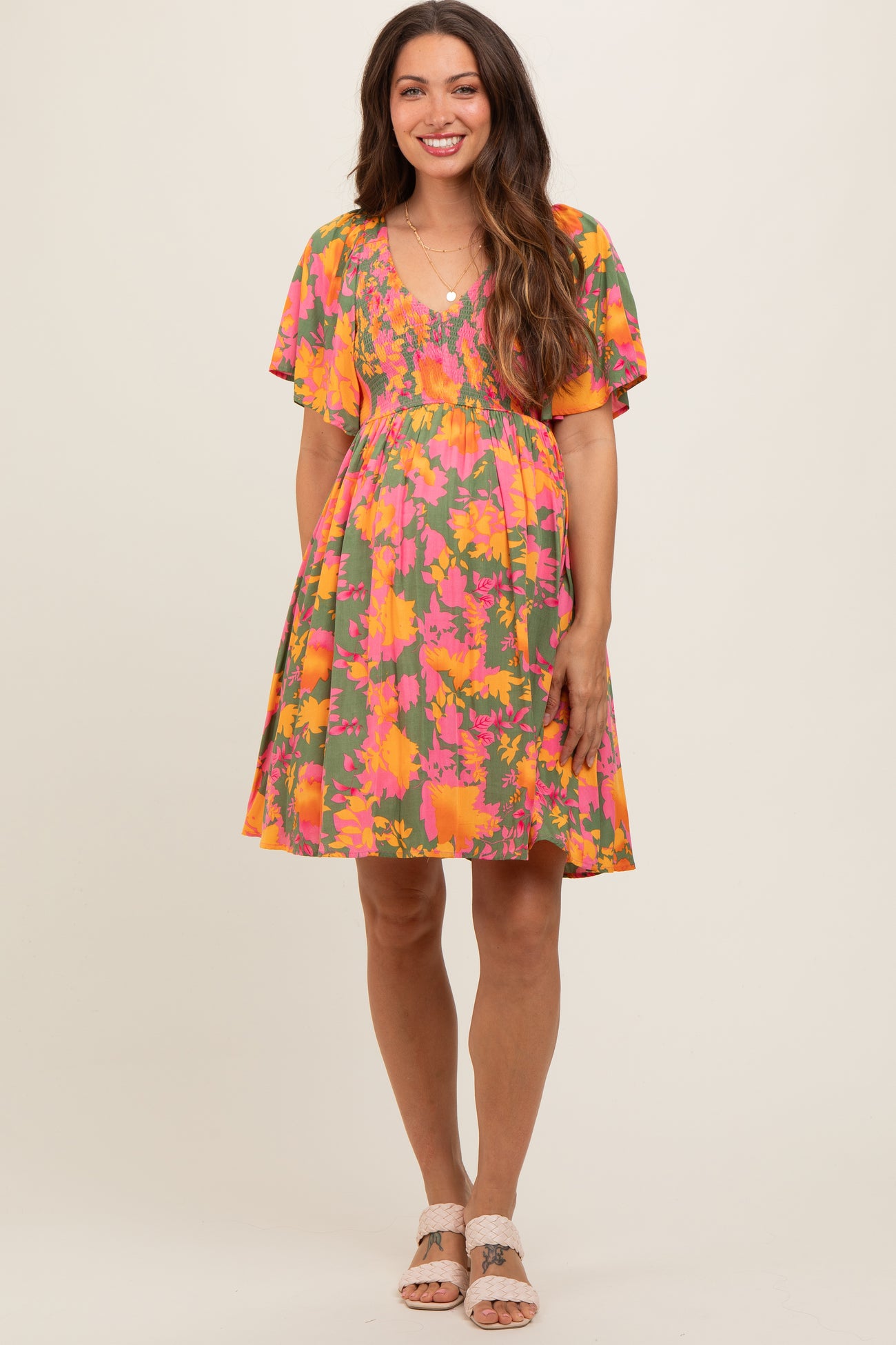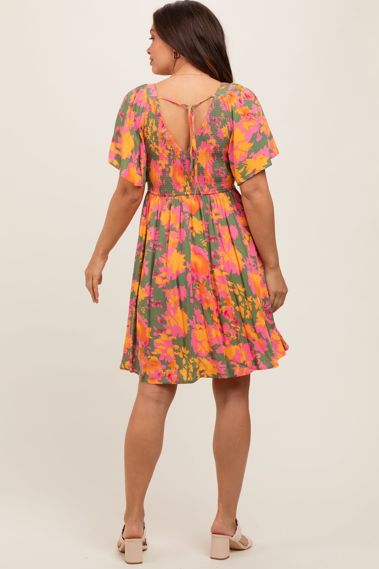 A printed maternity dress with a v-neckline, a smocked bodice, a back tie, short flounce sleeves, and a lined body.