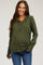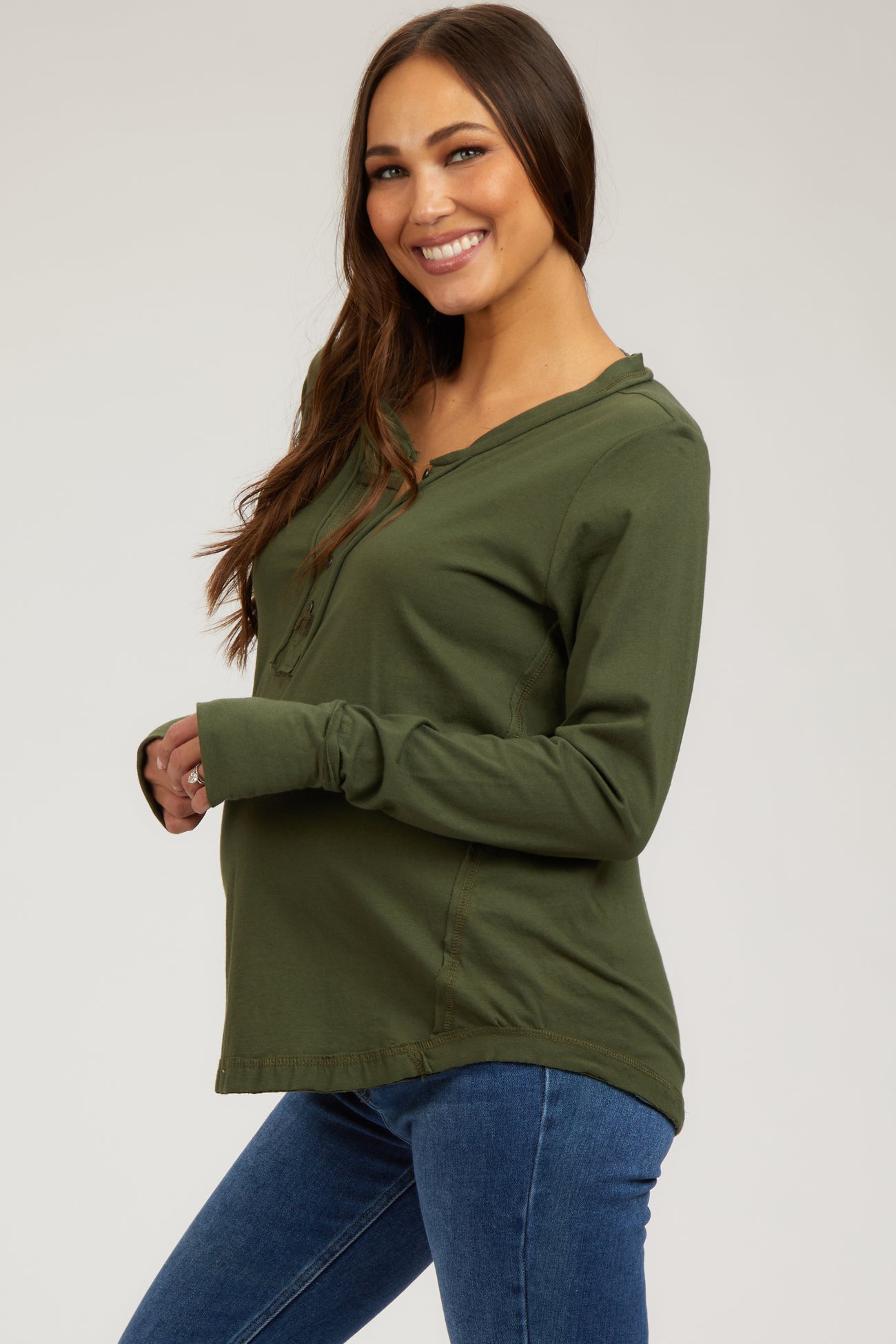 A solid hued maternity top featuring long sleeves with thumb holes, an exposed seam, front buttons and a curved hem.