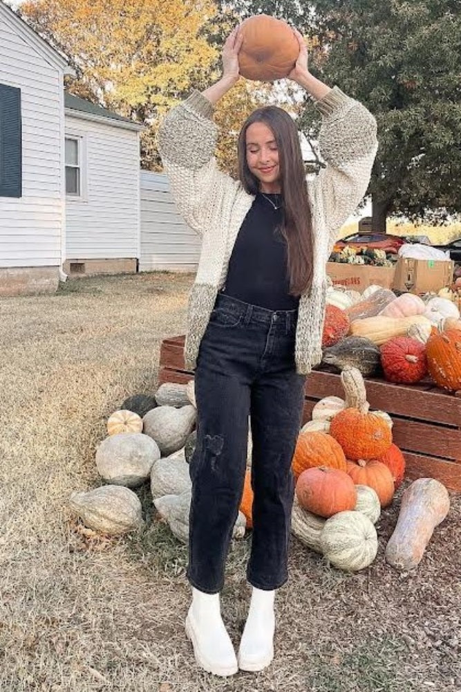 An open knit cardigan. Features drop shoulder long sleeves, an open front, and color blocking on the bottom half.