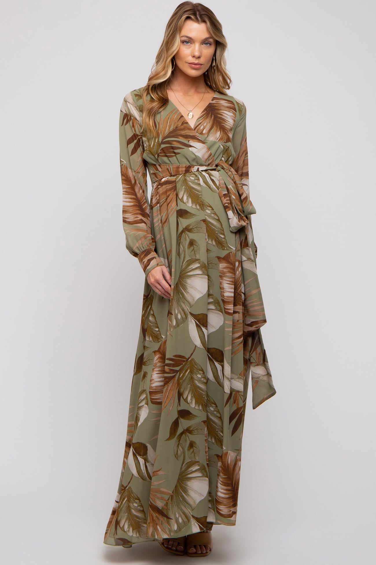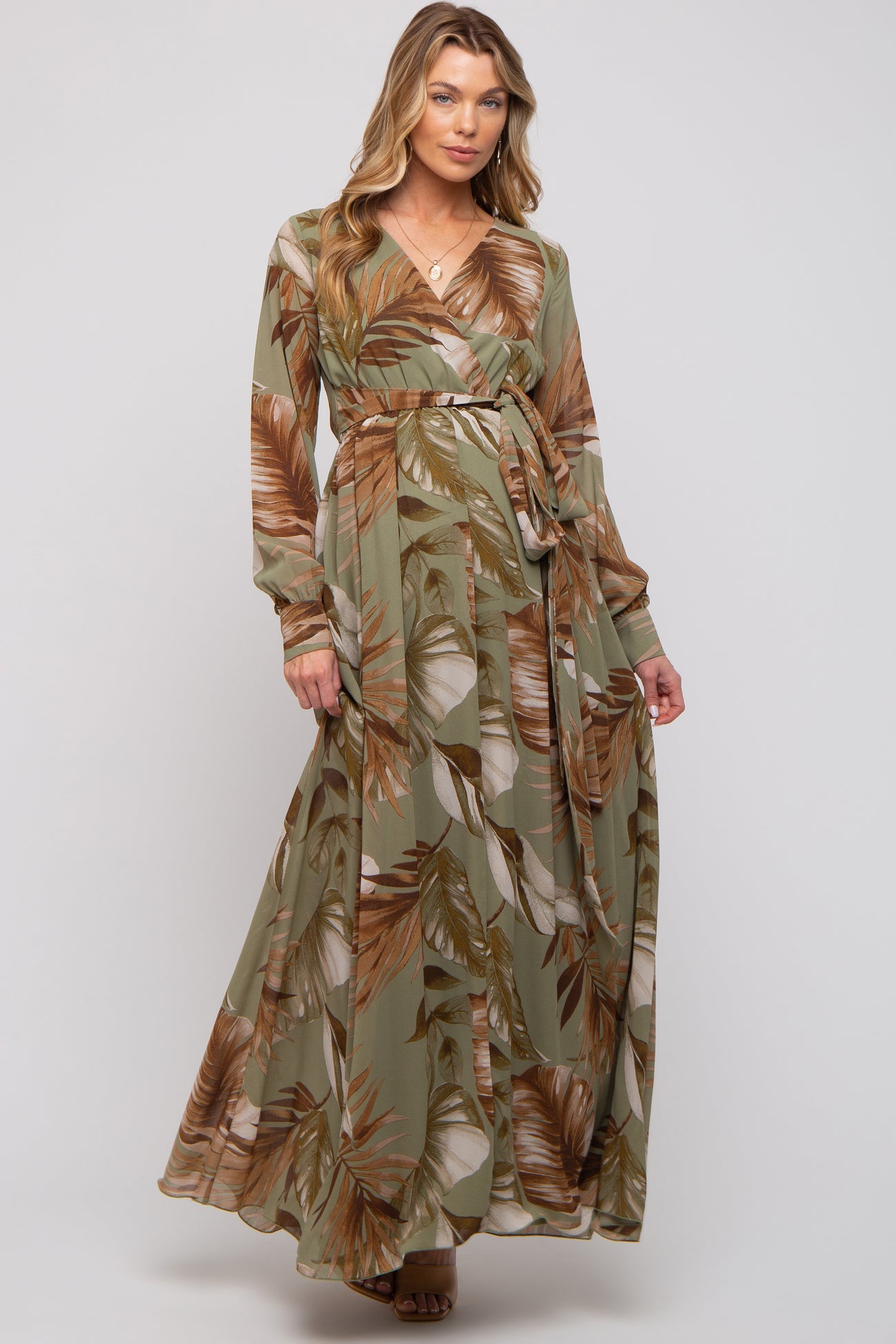 Olive Palm Print Chiffon Wrap Front V-Neck Long Sleeve Maternity Maxi Dress