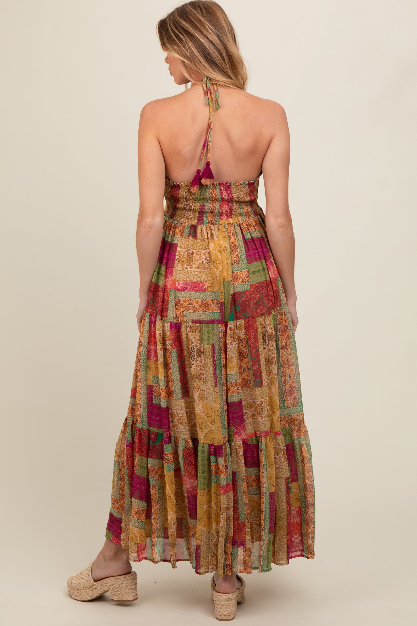 Olive Patchwork Print Halter Maternity Maxi Dress