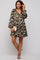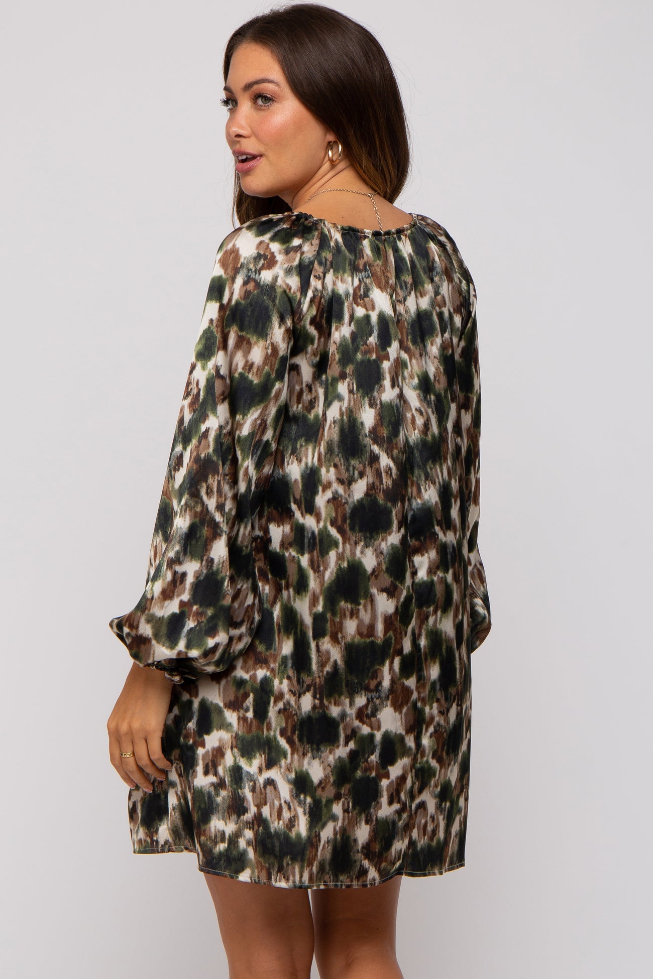 A printed maternity dress featuring long sleeves, side pockets and a v-neckline. Double lined.