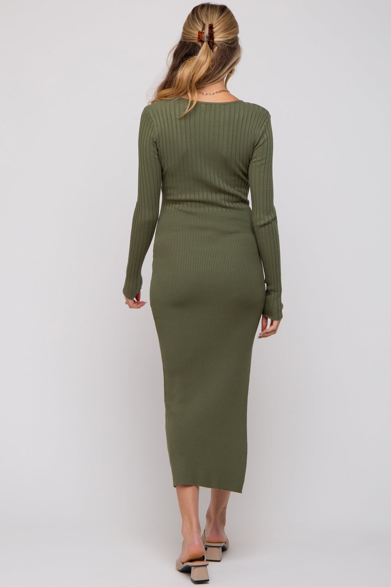 Olive Ribbed Fitted Long Sleeve Maternity Maxi Dress