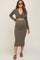 A ribbed two-piece set featuring a lace-up with front cut-out crop top with long sleeves and a midi skirt.