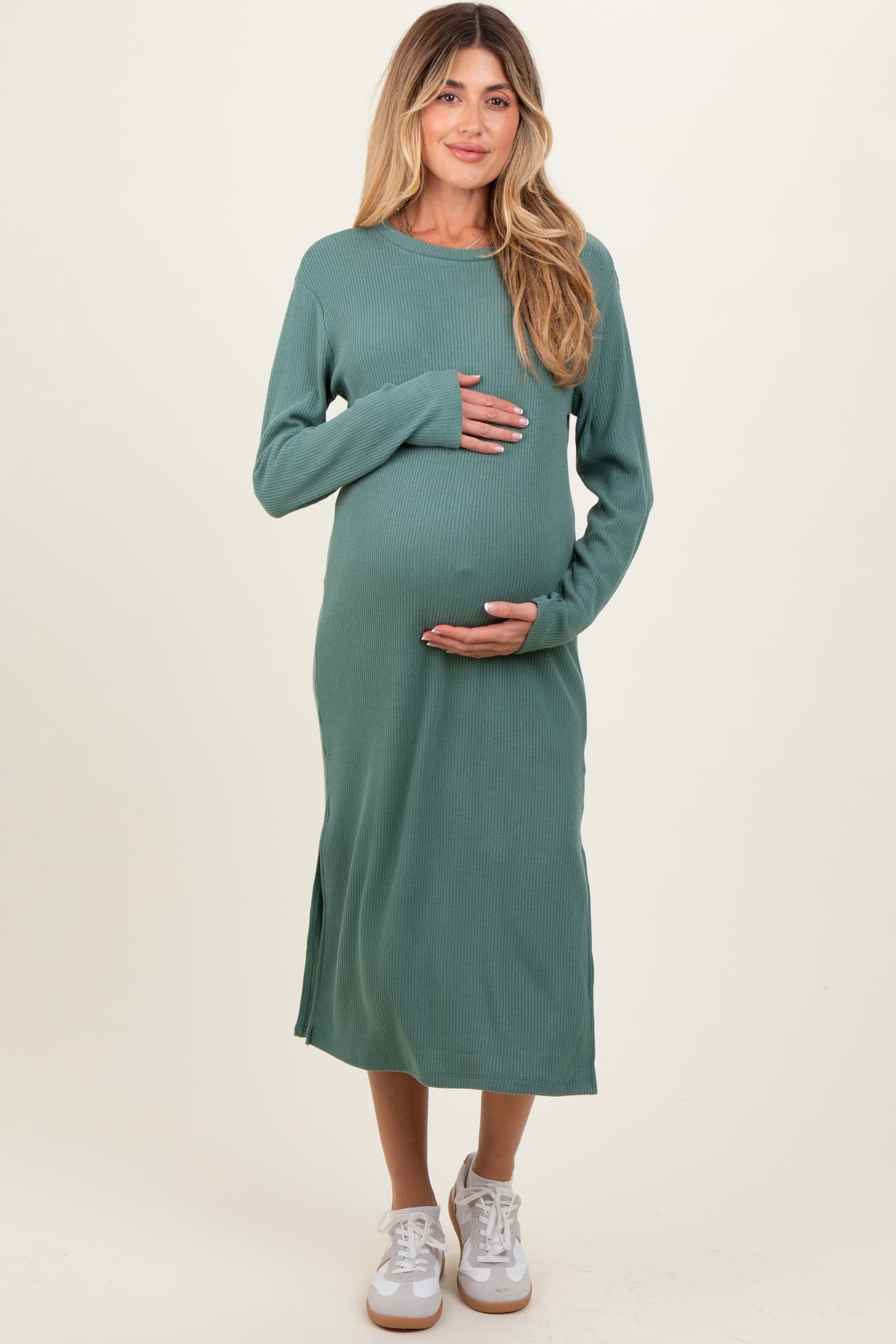 Olive Ribbed Knit Long Sleeve Side Slit Maternity Midi Dress
