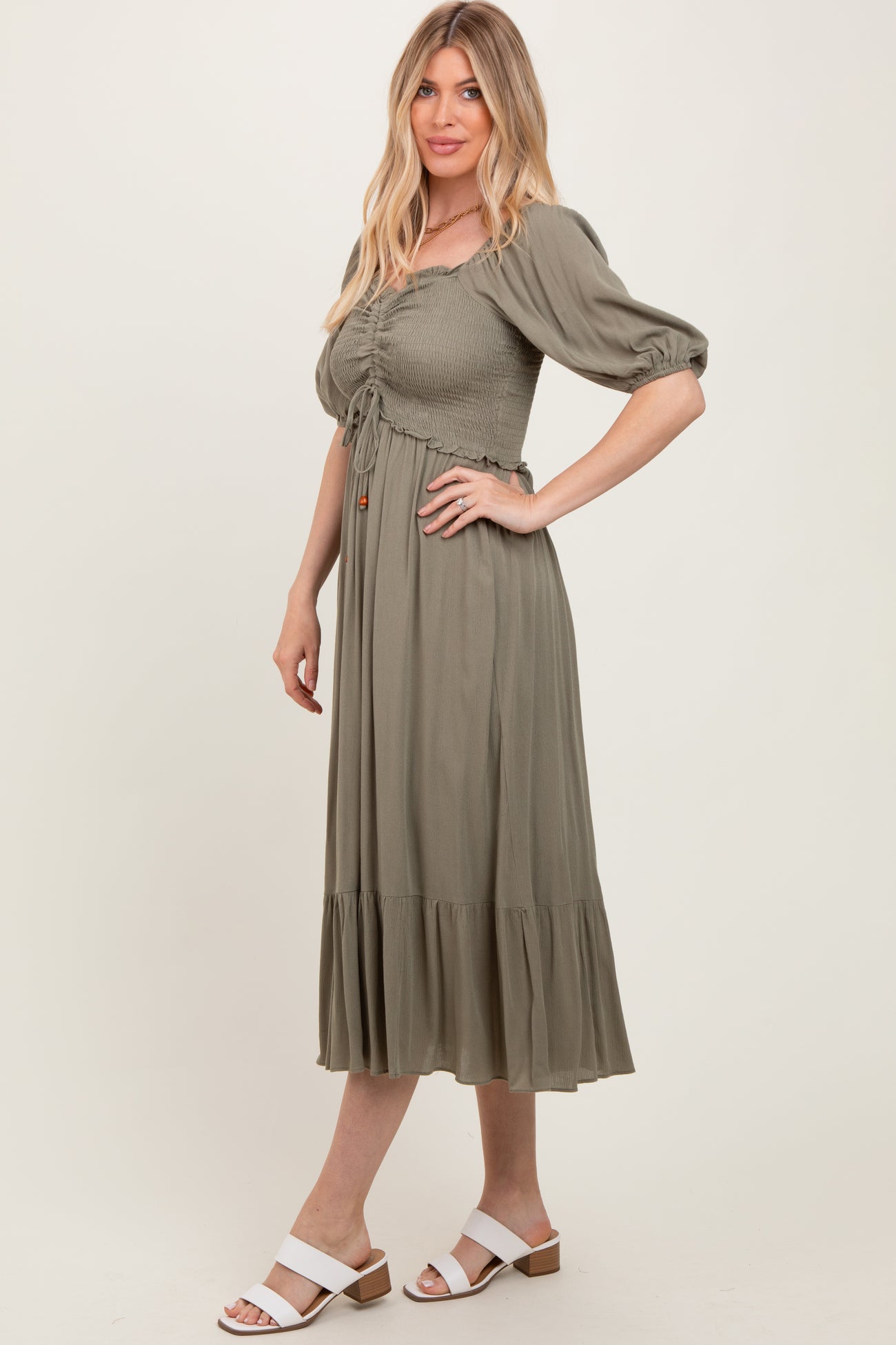 Elevate your wardrobe with this Olive Smocked Cinched Front Maxi Dress. Featuring a flattering smocked bodice and adjustable cinch detailing at the front, it perfectly accentuates your silhouette. The puff sleeves add a touch of romantic charm, while the flowing maxi skirt with a subtle ruffle hem offers effortless movement and grace. Crafted from lightweight, breathable fabric, this dress promises comfort for all-day wear. Whether you're dressing up for a summer brunch or a casual day out, this versatile olive maxi dress is your go-to choice for stylish, easy elegance. Pair it with sandals or heels for a complete look.
