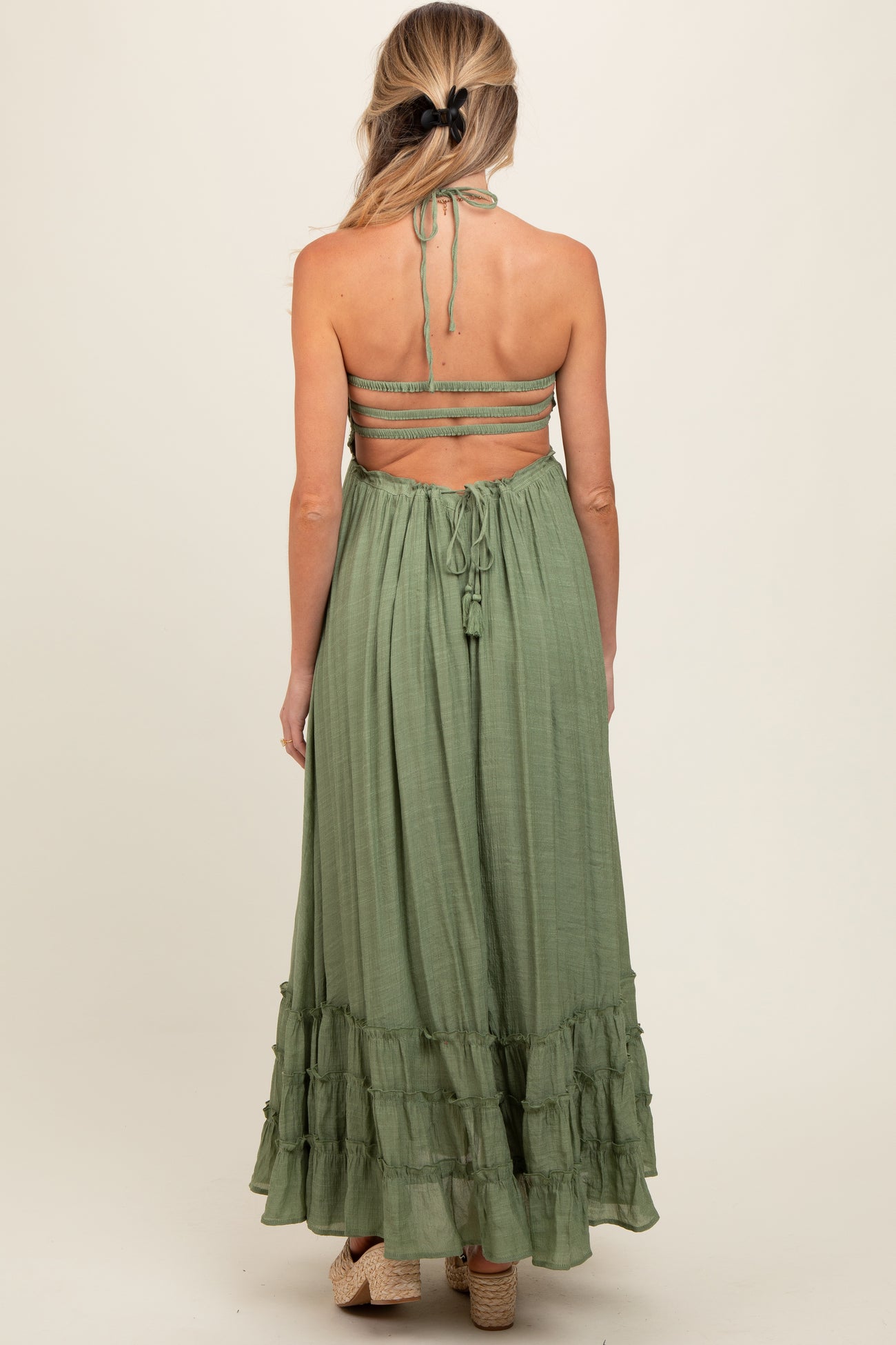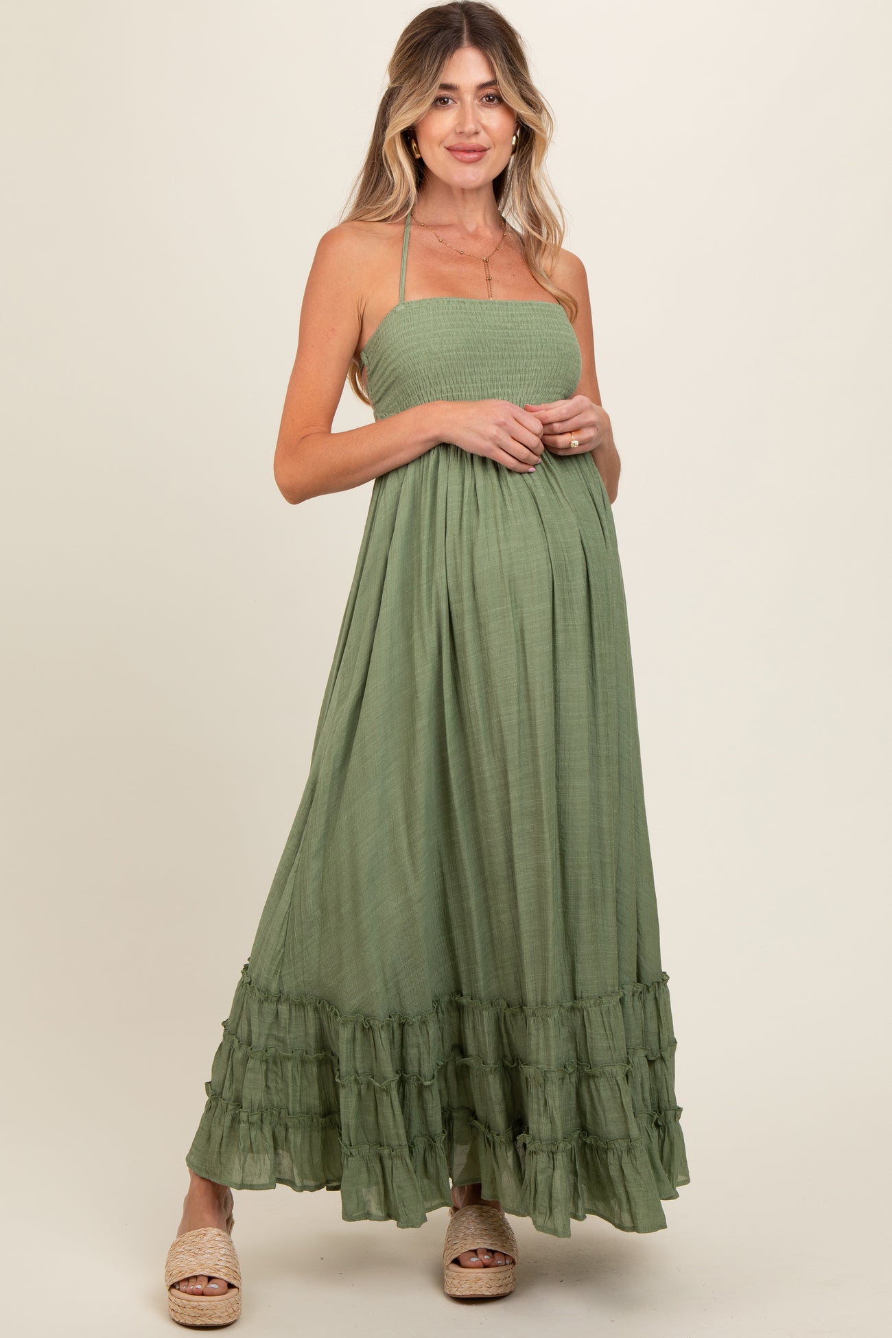 Olive Smocked Halter Cutout Maternity Maxi Dress