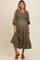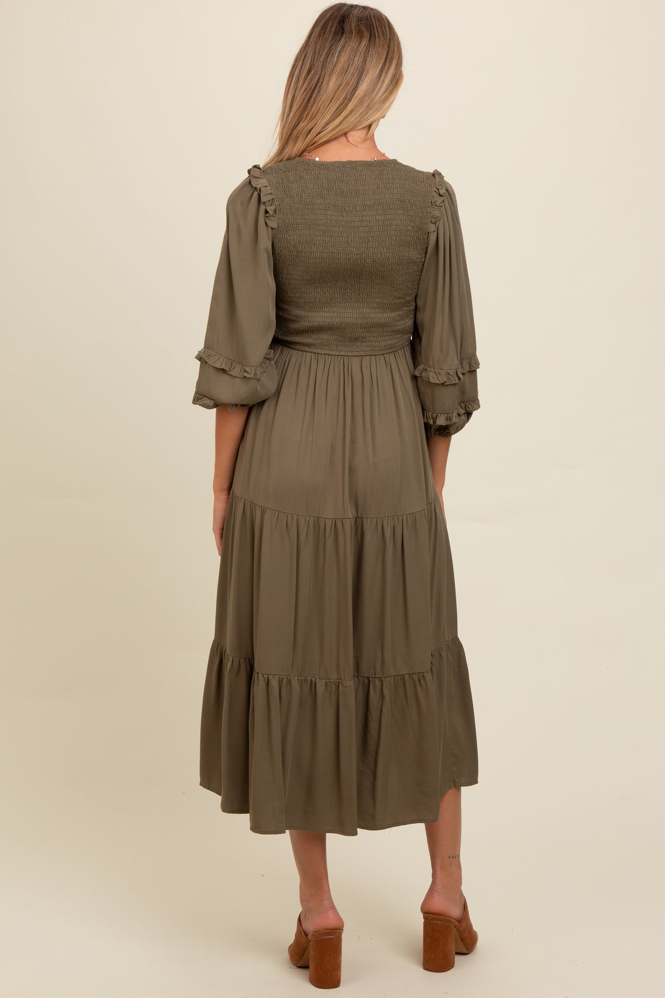 Olive Smocked Ruffle Shoulder Tiered Maternity Midi Dress