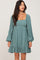 A solid hued dress featuring a square neckline, long puff sleeves, a smocked elastic back, a ruffle hem and a double lined skirt.